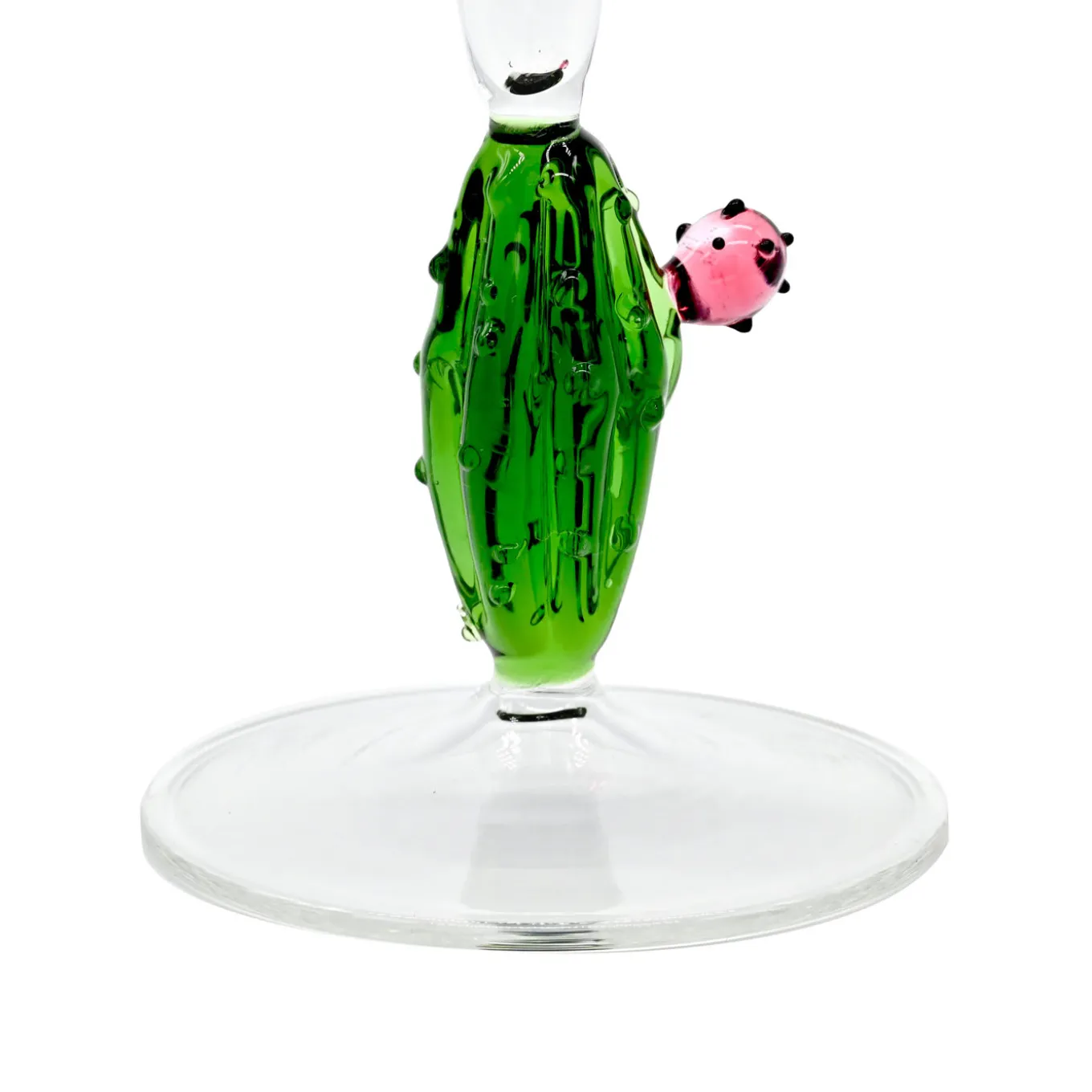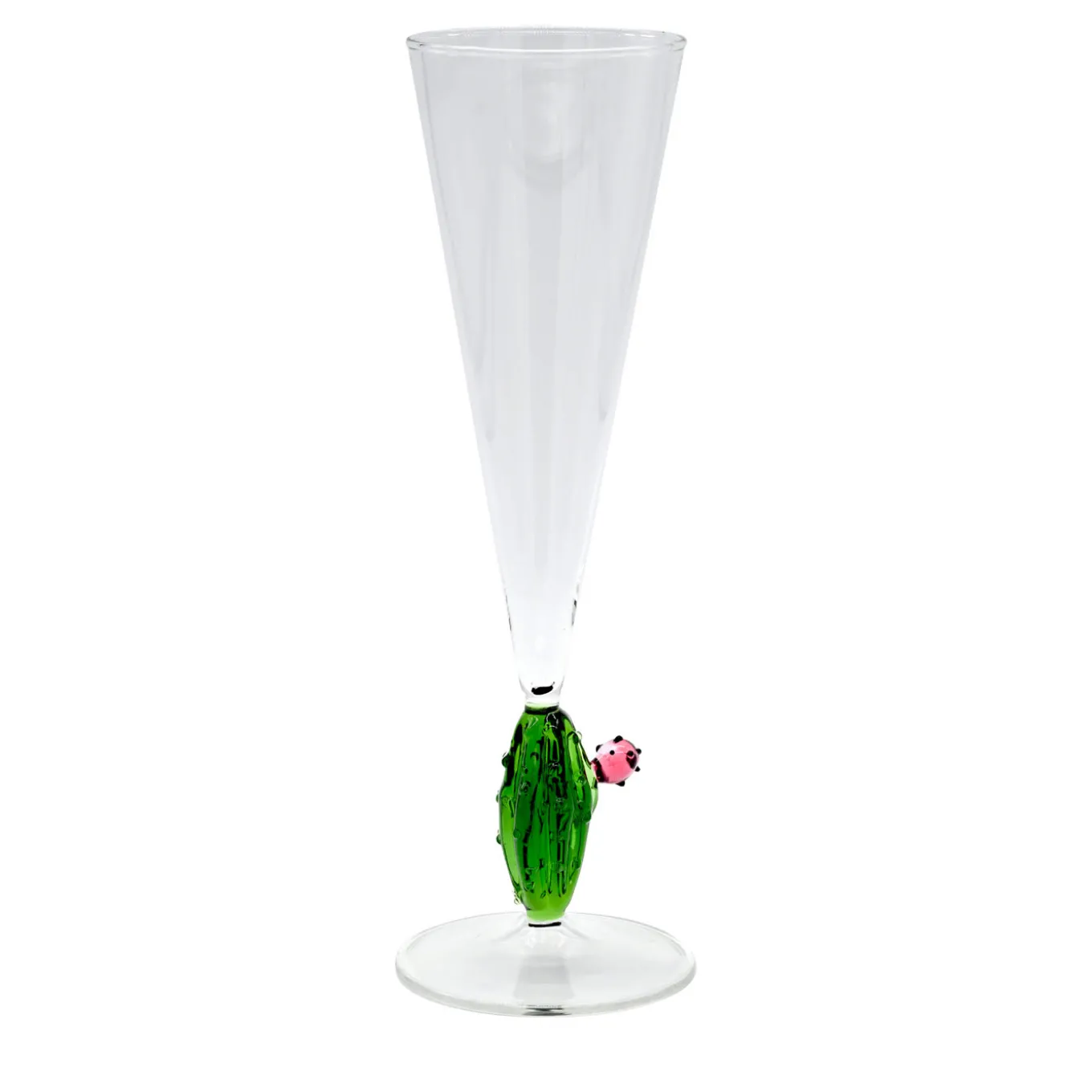 This set of four champagne flutes features stems in the shape of an elegant green cactus with flowering pink detail. Handcrafted in Venice, each glass requires the work of two artisans — one who makes the transparent glass bowl and the other for the stem. This set is also available in a frosted version. Height: 21 cm.
