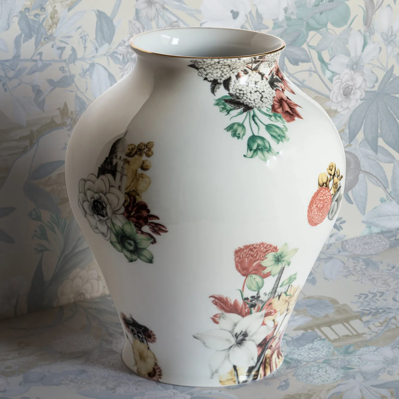 Designed by Vito Nesta as part of its signature Grand Tour Collection, this captivating porcelain vase is characterized by a classical shape revisited with a totally contemporary look. The unexpected combination of Middle Eastern architecture and floral design pattern in green, red, and yellow hues hand-painted over the sleek white surface makes this vase an eye-catching centerpiece for any table.