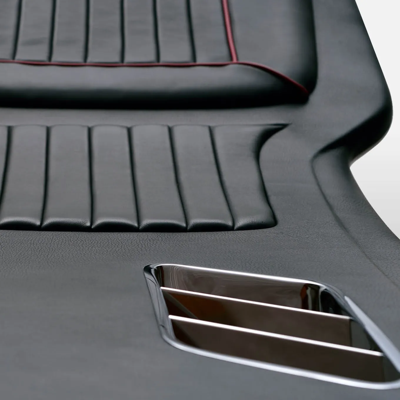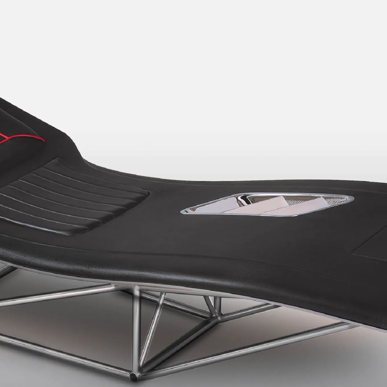 Distinctly inspired by the seductive profile of 250 GT SWB Ferrari, this chaise longue is singular in its sleek functionality. The tubular trellis steel frame supports the slender, anatomical resting surface crafted of hand-molded flex wood with natural leather upholstery and calf leather only for the raised backrest and seat. The distinctive detail of the air vent grill set into the hood-like area is handcrafted of steel with little wings in polished aluminum.