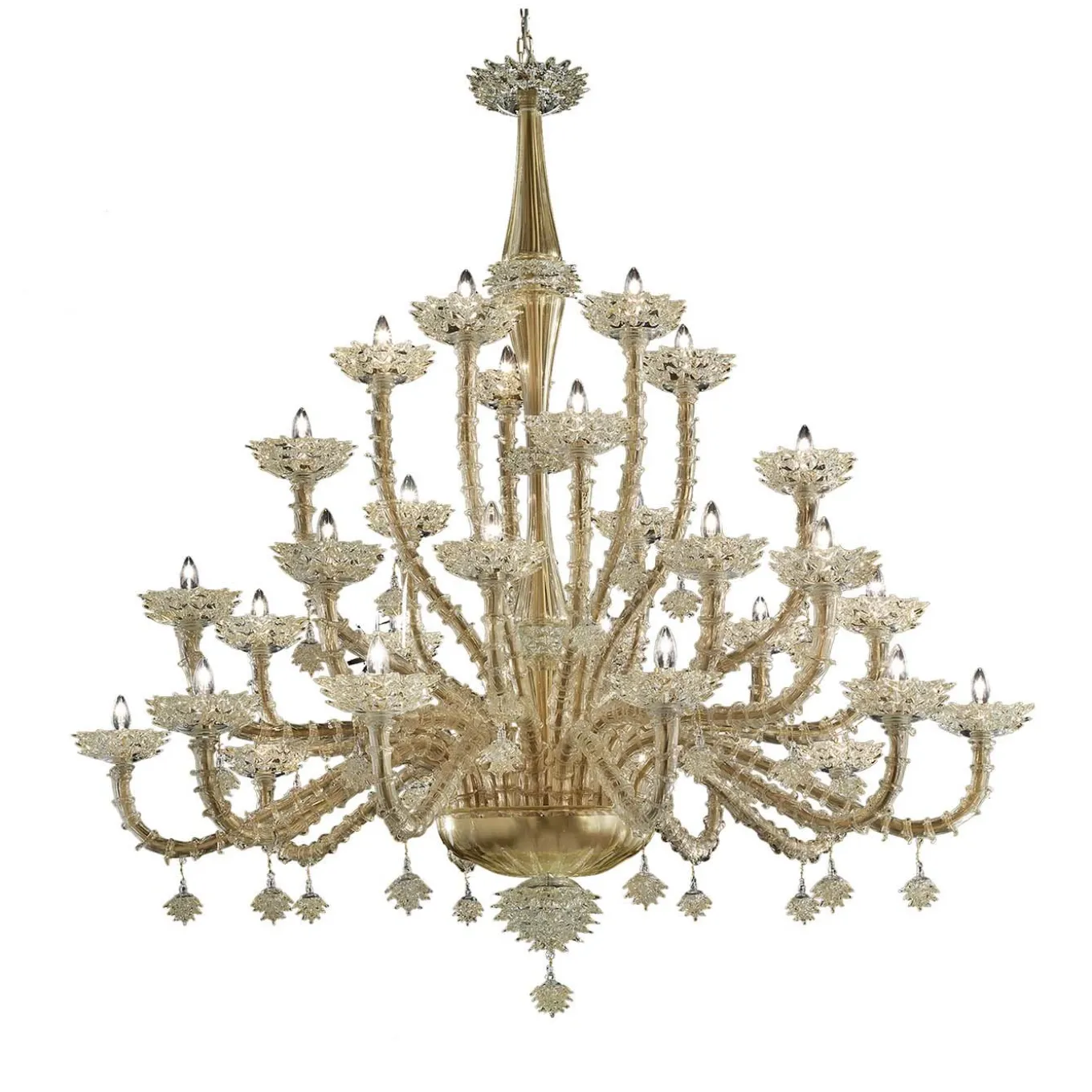The Calle Frizier Chandelier is an exquisite lighting accessory entirely handcrafted from glass that will elegantly enhance the look of your modern or classic decor. Measuring 178 cm in height and 178 cm in diameter and holding 30 lamps, this glorious piece features gold coloring and is inspired by the Cà Rezzonico style.