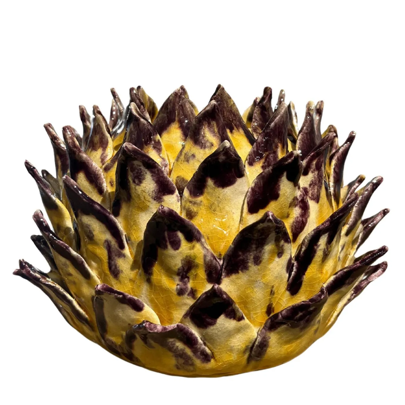 The Calliroe Ceramic Vase, part of the Cynara collection, embodies a harmonious blend of nature and mythology, drawing inspiration from the legend of the nymph Cynara, who was transformed into an artichoke by Zeus. Crafted from refractory clay, this striking vase features a mesmerizing crackle effect, with sculpted leaves that unfold in dynamic movement, evoking the essence of an ancient bloom. Its rich color palette pairs warm honey tones with deep plum hues, enhancing its organic shape and creating a refined contrast that is both inviting and sophisticated. The iridescent, textured surface captures and refracts light, adding a luminous depth to its form. With its sinuous curves and glossy finish, the Calliroe Vase is a statement piece that transforms any space, celebrating the artistry and craftsmanship. Each piece is unique, due to handcrafting, slight changes may occur.