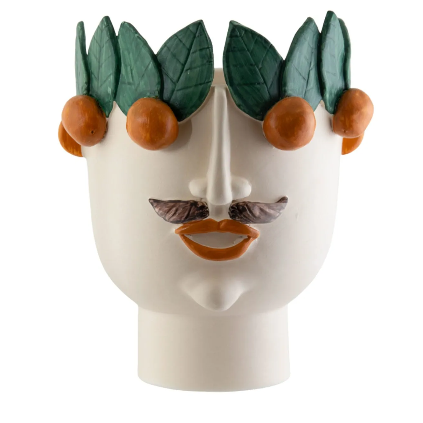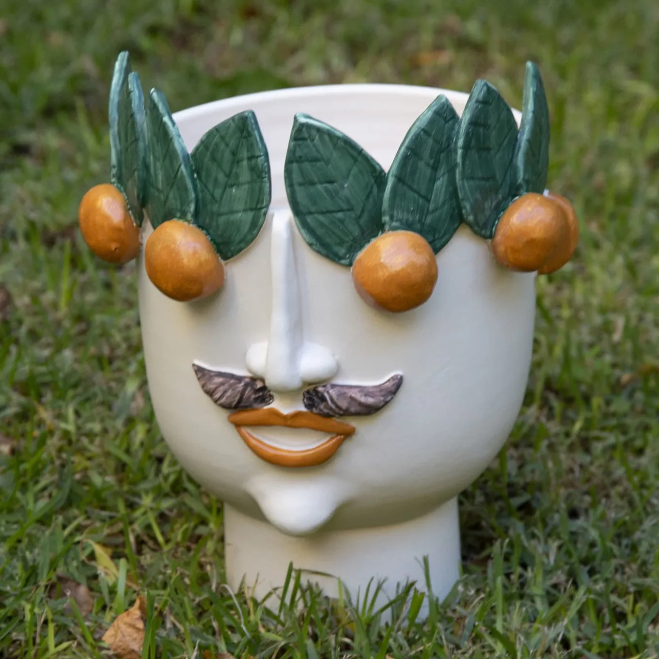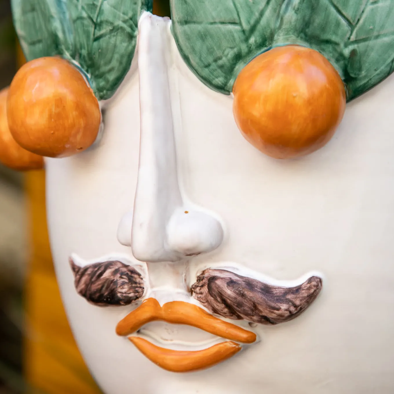 The second fire-fired ceramic head, handmade with face and mandarin reliefs, can be used to hold plants, flowers and sometimes even bottles with ice. Calogero sells mandarins at the Palermo market, a serious and old-fashioned man, a hard worker!
