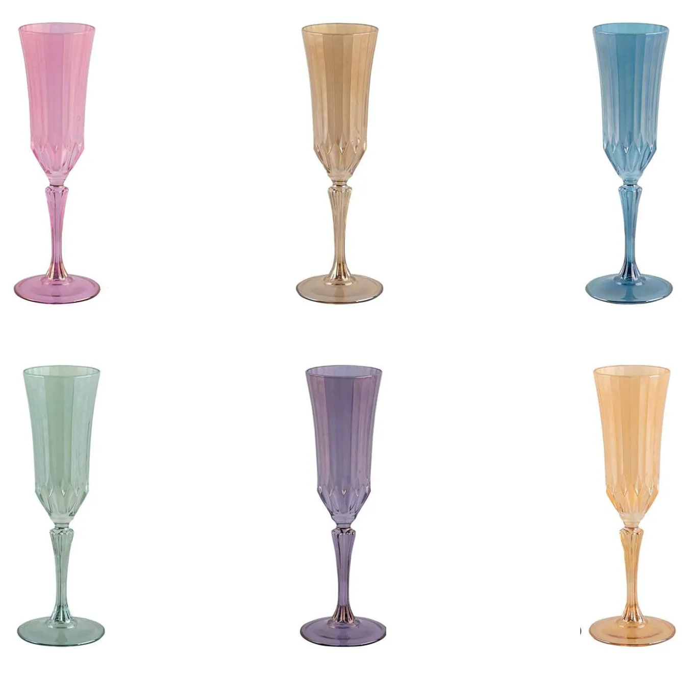 Part of the Riflessi Collection of refined handcrafted glassware, this set of six flûtes will be a sophisticated addition to a modern decor. Showcasing six different colors, each piece is marked by exquisite engravings of high textural value.