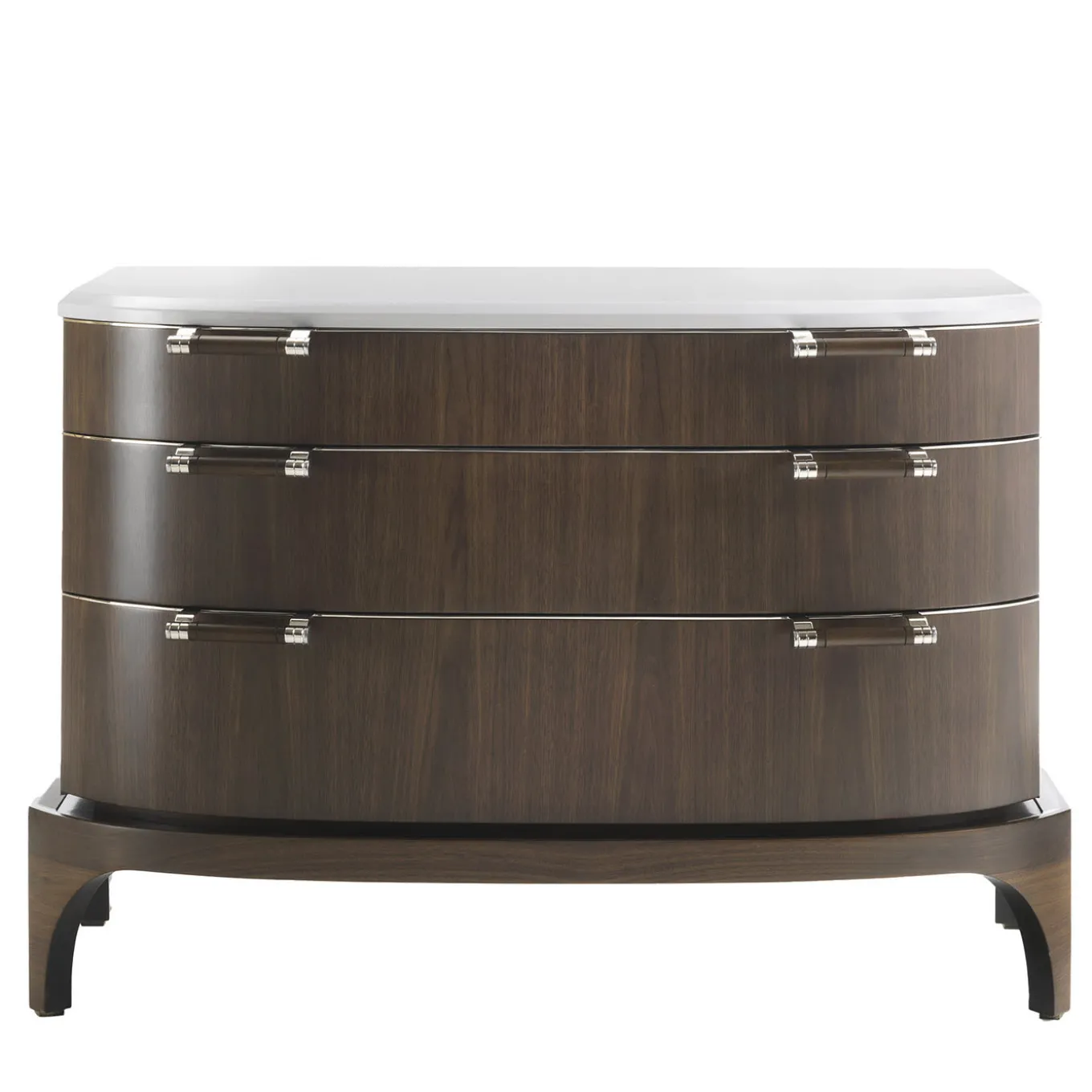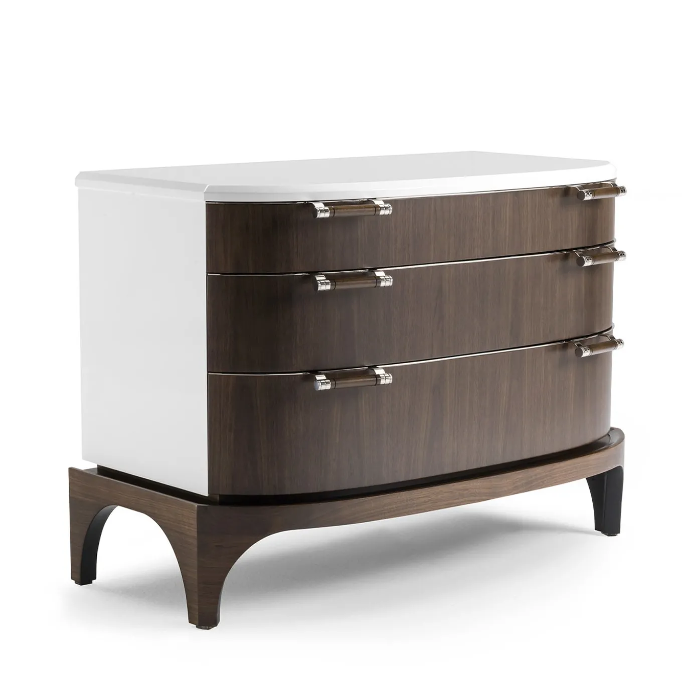 The perfect complement to the Canaletto Walnut Bedside Table, this gorgeous design features clean and rounded lines of utmost sophistication. Stately yet versatile, this dresser features a white-lacquered wooden top and is fashioned of Canaletto walnut, also available in a walnut burl. Its three drawers feature nickel handles, customizable in polished brass upon choice, please contact the Concierge for more information.