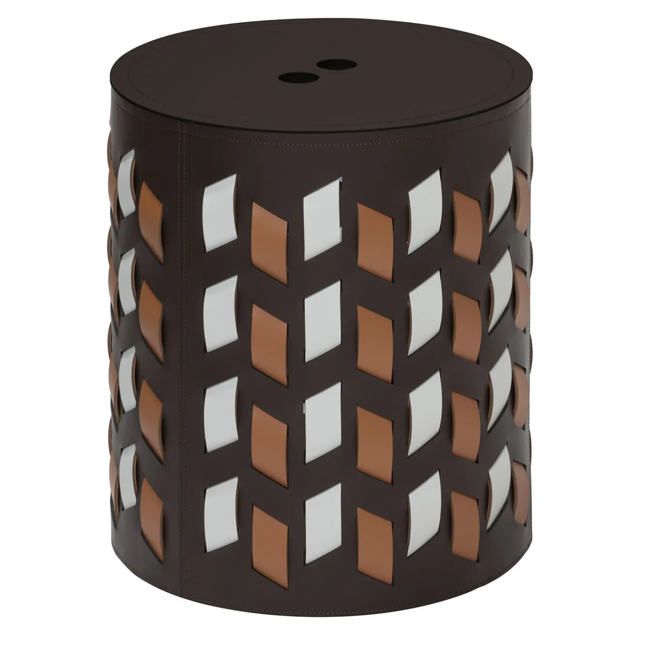 The Cancun baskets are characterized by a weave that develops only through vertical dotted lines that, being cut diagonally, give life to a design that reminds of the warm and retro atmospheres of certain fabrics typical of Central America. Finest regenerated reinforced leather structure with water-resistant and UV-resistant finish. Non-slip waterproof rubber base underneath. Fit for both indoor and outdoor use. Other colors are available. Please ask Concierge for details.