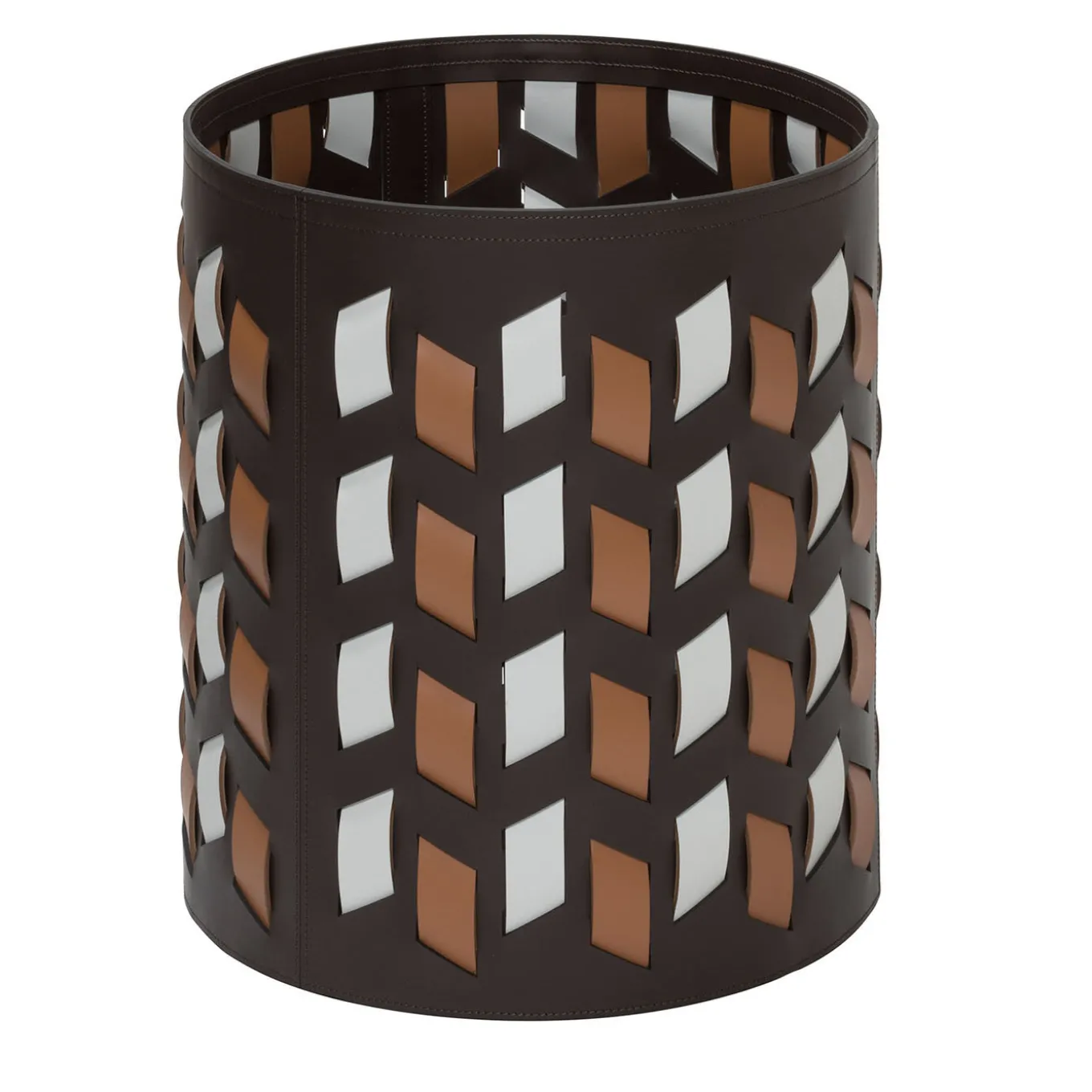 The Cancun baskets are characterized by a weave that develops only through vertical dotted lines that, being cut diagonally, give life to a design that reminds of the warm and retro atmospheres of certain fabrics typical of Central America. Finest regenerated reinforced leather structure with water-resistant and UV-resistant finish. Non-slip waterproof rubber base underneath. Fit for both indoor and outdoor use. Other colors are available. Please ask Concierge for details.