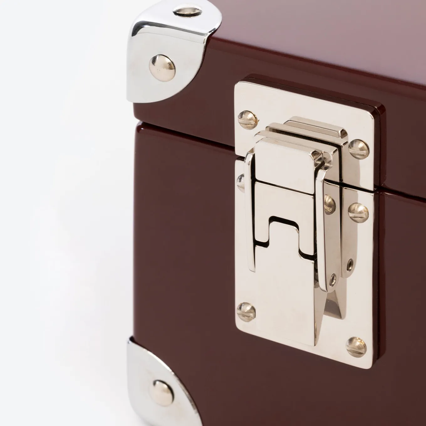 This Cannes bottle trunk features a glossy lacquered exterior with chrome-plated brass corner details and clasps, complemented by a sturdy leather handle for easy transport. Inside, a lacquered finish and leather straps securely hold a bottle in place, making it a refined and practical gift presentation option. This medium-size trunk combines elegance with functionality, perfect for storing and gifting premium bottles.