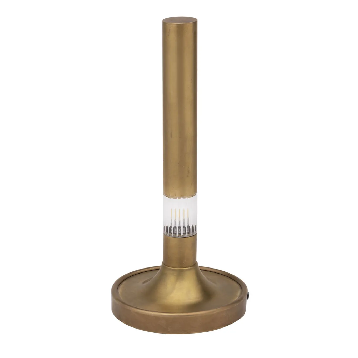 A compact wireless table lamp featuring a burnished amber brass finish with clean, essential lines. The cylindrical lamp body incorporates a rechargeable LED light activated by touch, offering soft illumination ideal for creating an intimate atmosphere. Designed to complement sophisticated interior or outdoor spaces such as bistro tables or patios, it adds a subtle yet elegant decorative element blending sculptural aesthetics with contemporary functionality.