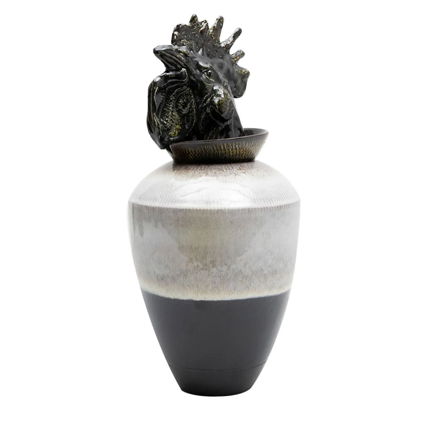This vase is directly inspired by Egyptian canopic jars; it is an ironic and contemporary reinterpretation of an ancestral object, a tutelary deity of domestic tranquility. A creature with a magical aura, endowed mostly with positive connotations, the rooster is an animal that brings light, cheerfulness, and the ferrying man out of the nightmares of the night. Handcrafted and glazed with oxides and crystallines, the work becomes a unique, precious, and sculptural object.