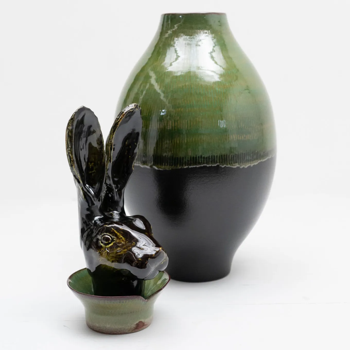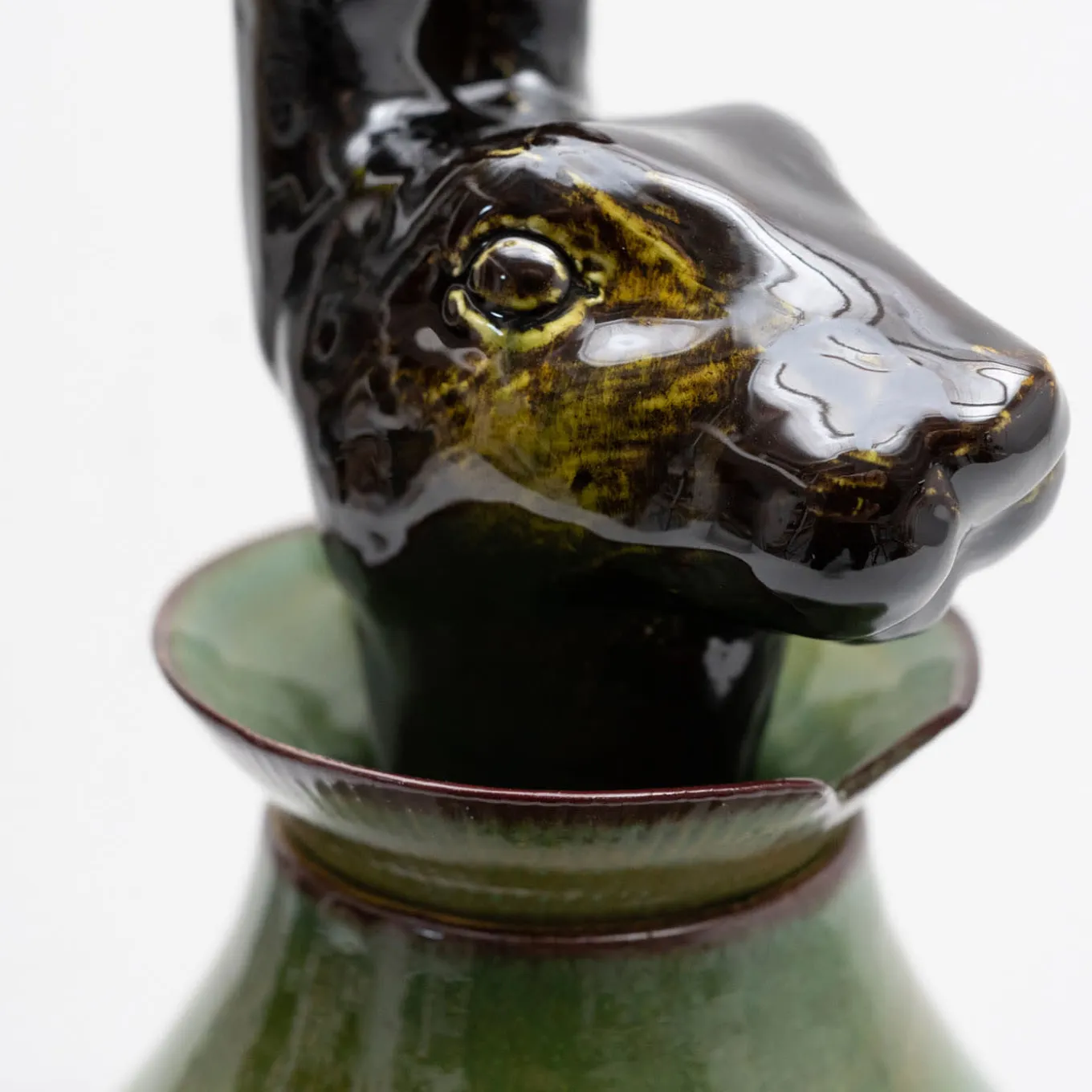 This vase is directly inspired by the Egyptian canopic jars; it is an ironic and contemporary reinterpretation of an ancestral object, the tutelary deity of domestic quiet. The rabbit is in fact a symbol of abundance, prosperity, and longevity and more simply a beautiful animal. Made by hand and enameled with oxides and crystallines, the work becomes a precious and sculptural object.