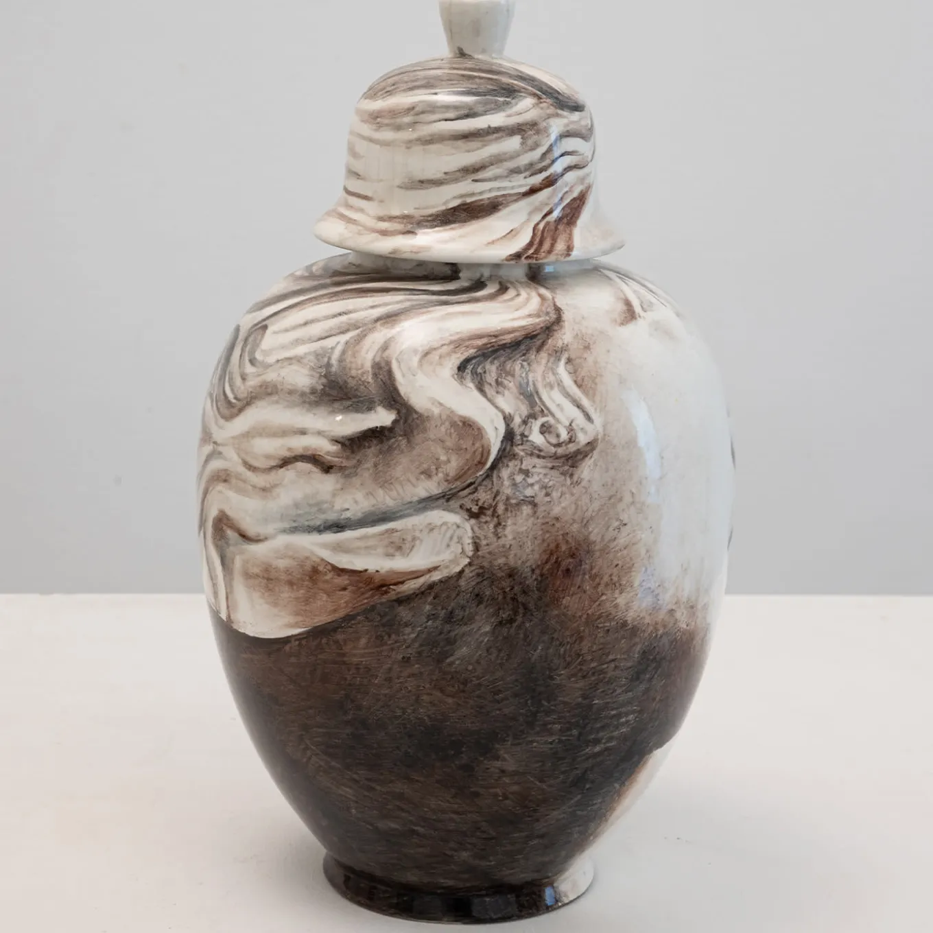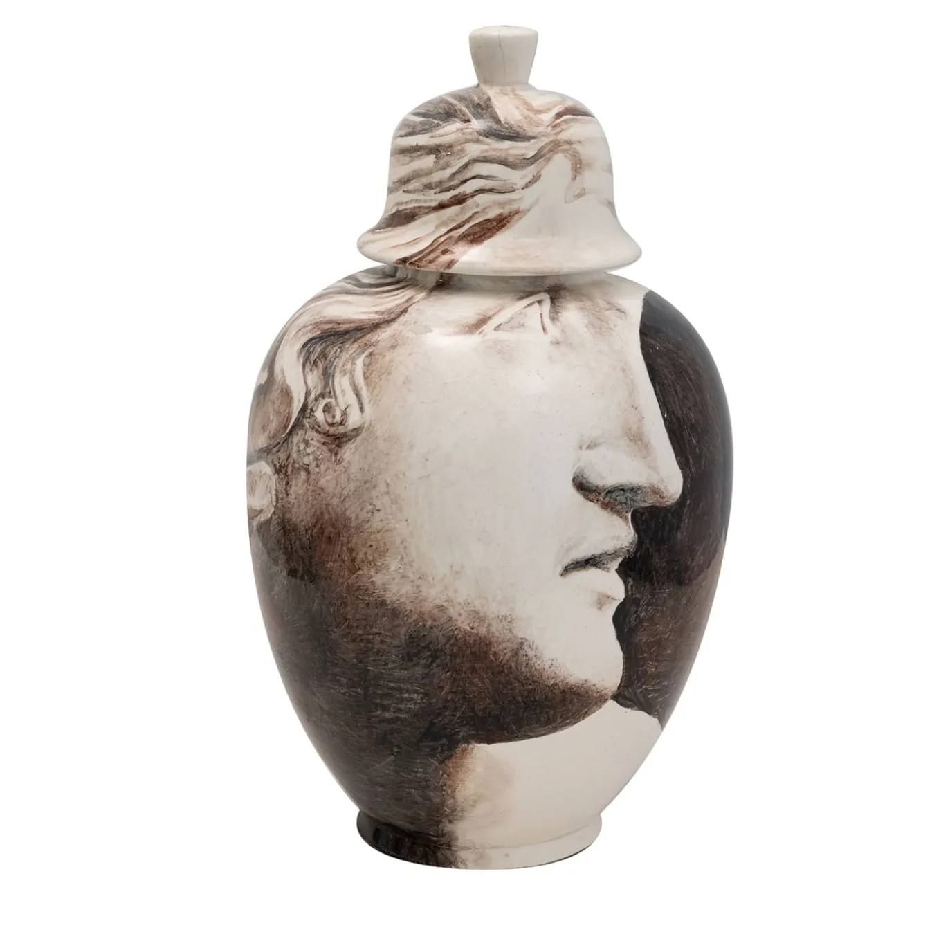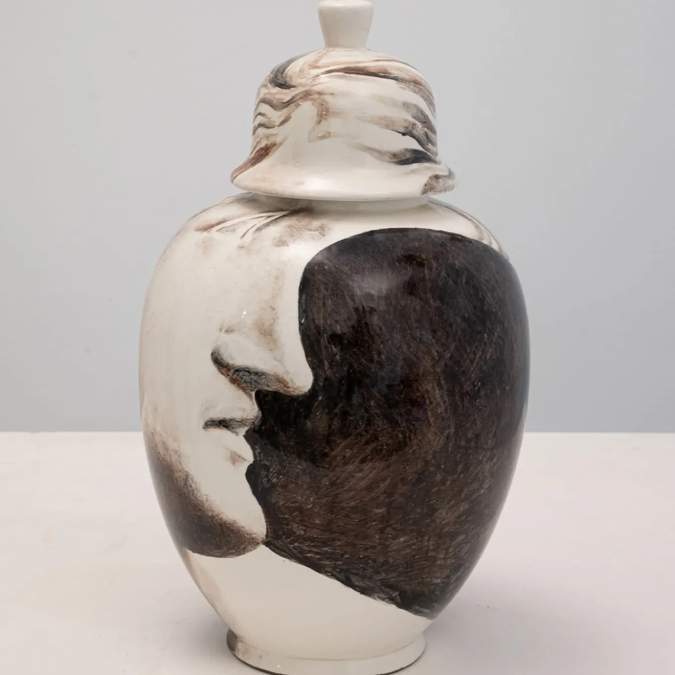 This potiche is a unique piece and is part of a collection made up of several anamorphic ceramic works dedicated to the images of famous marble sculptures by Antonio Canova. The figure, which has been hand-painted by the artist, takes on the shape of the vase in a play of associations between two – dimensional images and volume, creating a dialogue between ceramics, painting and sculpture. It is an original work, the result of a research on the theme of perspective and distortions of perspective.