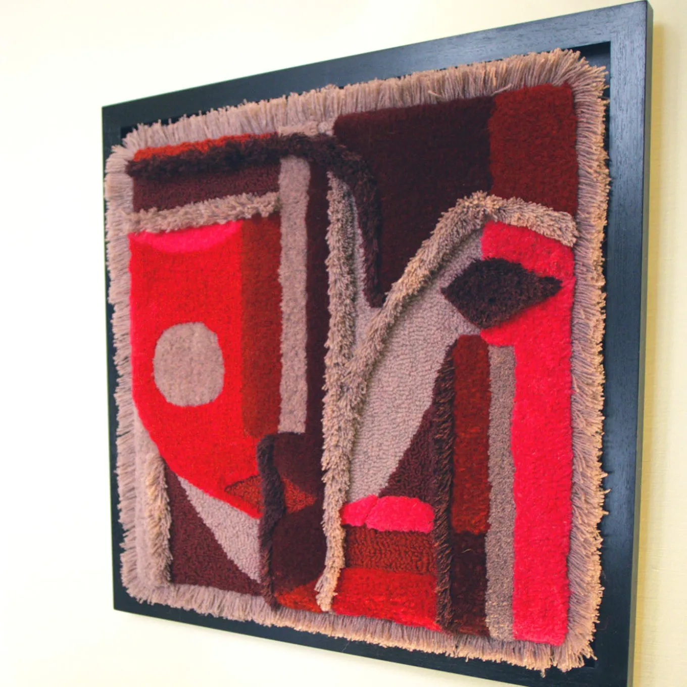 The designs for the tapestry series CAPOVOLTO are based on a mask with human facial features that are reflected upside down. An individual character has different moods and sides of his or her personality. Which one is prevailing? The artwork can also be hung upside down (in Italian you say ‘capovolto’) making the other mood prevail. The colors are bright pink, red and burgundy in a three-dimensional finish. The tapestry has a black wooden frame. The artwork is numbered and signed by the artist.