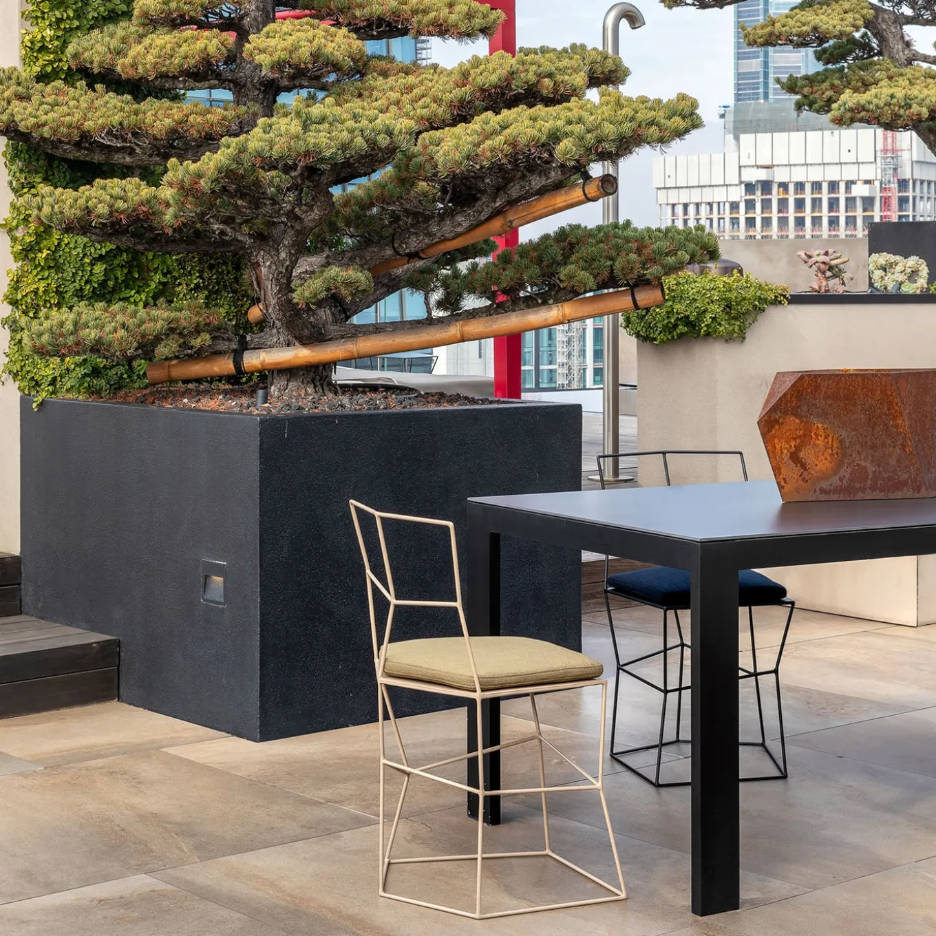Striking in its airy and irregular design, this sculptural chair is a captivating artisan masterpiece obtained from the careful manual work of skilled craftsmen. The tempered iron-wire frame is offered in a glamorous cappuccino-toned powder varnish, a chromatic choice reinforced by the coordinated cushion complementing the seat. Black cherry and blueberry variants are available, please contact the Concierge for additional information.