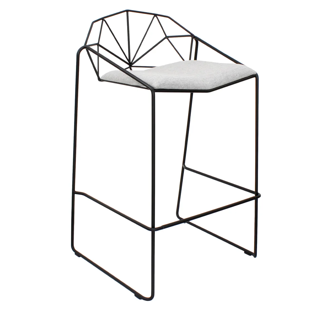 The Capri black and gray stool features a modern geometric design with a sleek matte black frame crafted from metal rods. Its cushioned seat is made from 100% recycled wool, offering padded comfort with an eco-friendly touch. The stool combines contemporary style with sustainable materials, making it suitable for stylish bar or kitchen counter seating. The open, angular backrest adds visual interest while maintaining a minimalist aesthetic.