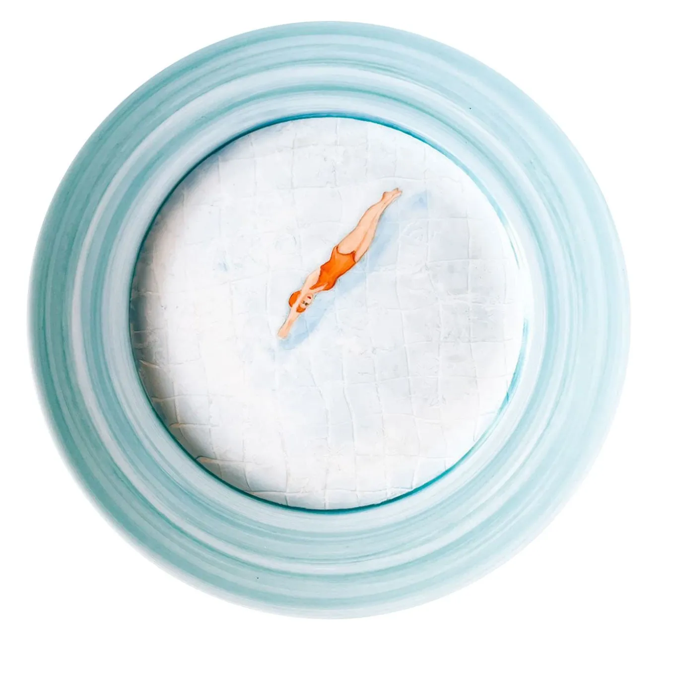 Inspired by la dolce vita on the Capri island during the ’50s and ’60s, this porcelain plate is a piece carefully decorated by hand and indeed unique. The striped turquoise brim, crafted on a lathe, encircles a female figure in the center frozen in the middle of a dive and emerging from a criss-cross surface decorated with nacre luster glazes. It withstands gentle dishwasher settings, but handwashing is recommended.