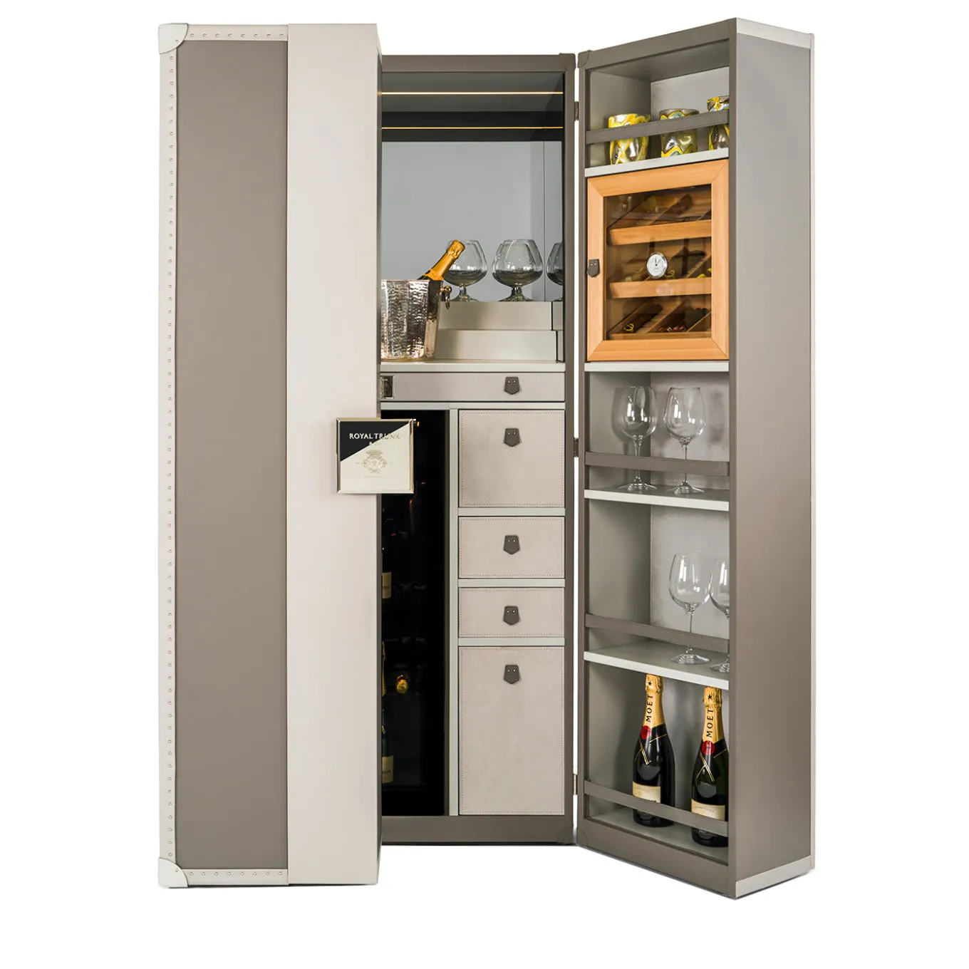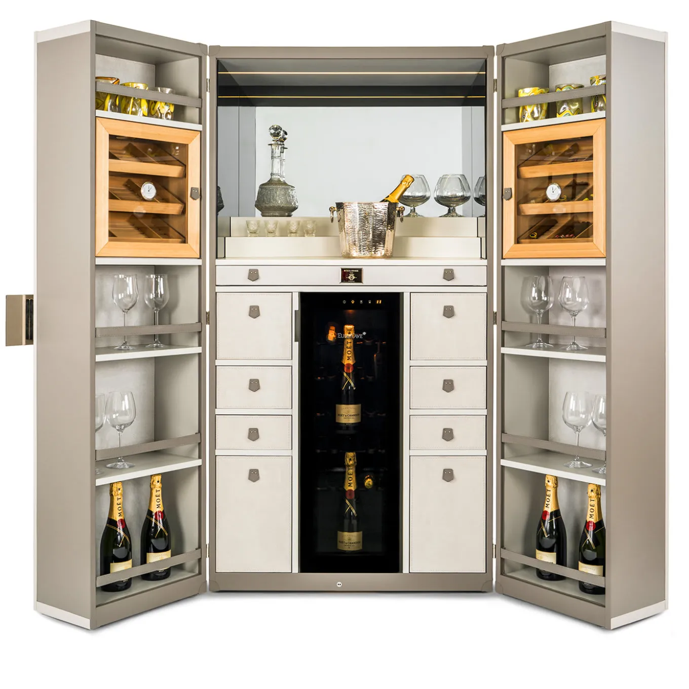Inspired by the renowned Mediterranean island of Capri, this exclusive piece was handmade by experienced artisans to celebrate the convivial ritual of cocktail and wine in style. An elegant structure in gray leather, with two doors opening at the center, reveals a central layout enriched with mirrors and lights, designed as surface to prepare cocktails and decant wine. The lower part features drawers with a soft-closing closure on the sides and a central canteen to keep the bottles refrigerated. The doors are deep set to host dedicated shelves with leather straps to hold glasses and bottles. This luxurious piece will bring glamour and sophistication in any home. Details are customizable in rare marbles and precious woods.