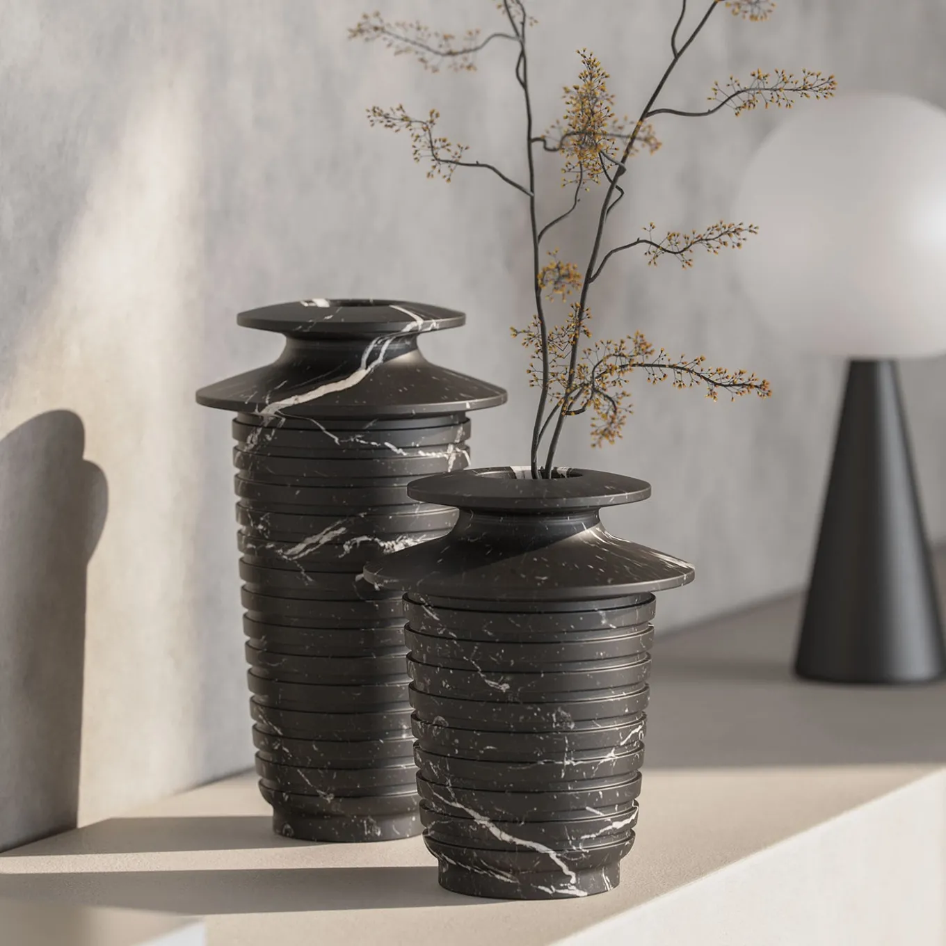 A dynamic silhouette in prized black Marquina marble marked by a grooved texture defines this exquisite vase, whose profile dramatically narrows to shape the sinuous and rounded lines tracing its neck. Subtle white veins only interrupt the deep black of the marble, their skyward orientation seemingly evoking a faraway inspiration that unexpectedly couples Greek and Roman amphoras with Renaissance sculpture tradition. This elegant piece is ideal for displaying colorful floral arrangements Please note that marbles and stones are natural materials and they can differ also if coming from the same quarry or the same block. The product shown may differ from purchased items. Every piece is unique.