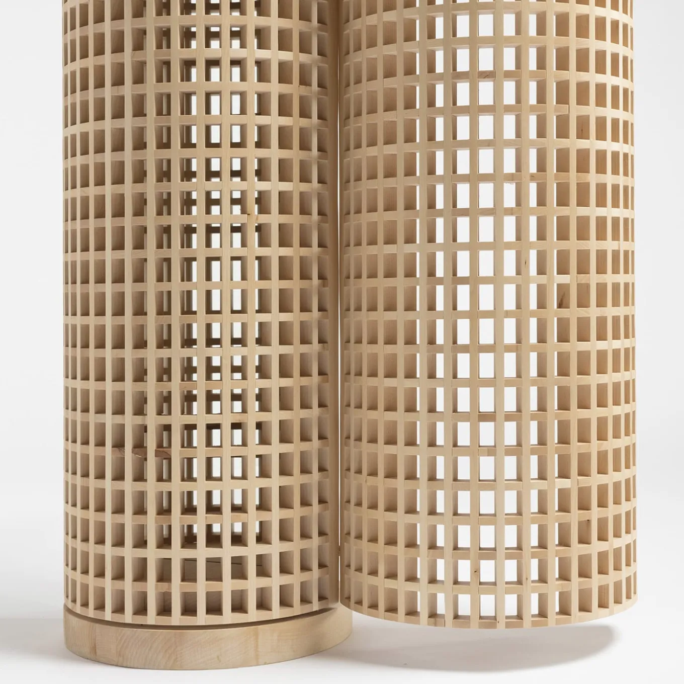 Nothing synthesizes the essence of “functional decor” better than this free-standing mirror. Sitting on a molded base, the slender, cylindrical structure in solid lime of this design can be half-opened to reveal the mirror housed within as a treasure chest discloses the gold coins it holds. The grid-like design lends the piece a visual lightness and a sense of subtle rigor that is tempered by its smooth lines.