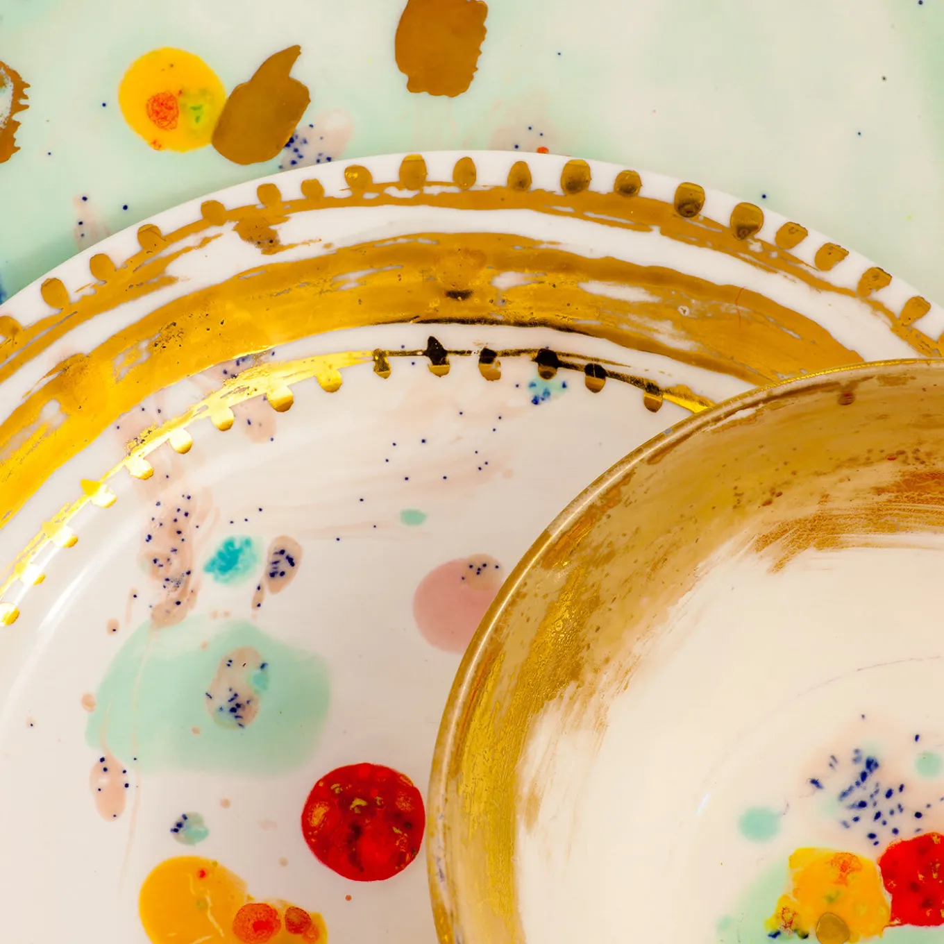 Sophisticated and modern, this oval serving plate will be a stunning addition to an eclectic home, where it can be combined with the other items in the Caravaggio collection or be used by itself as centerpiece or decorative accent. Its elongated silhouette was crafted by hand of porcelain and boasts an expressive decoration with exquisite splashes of vivid pale blue, yellow, and red colors on the white surface. A gold leaf-coated rim completes this stunning design.
