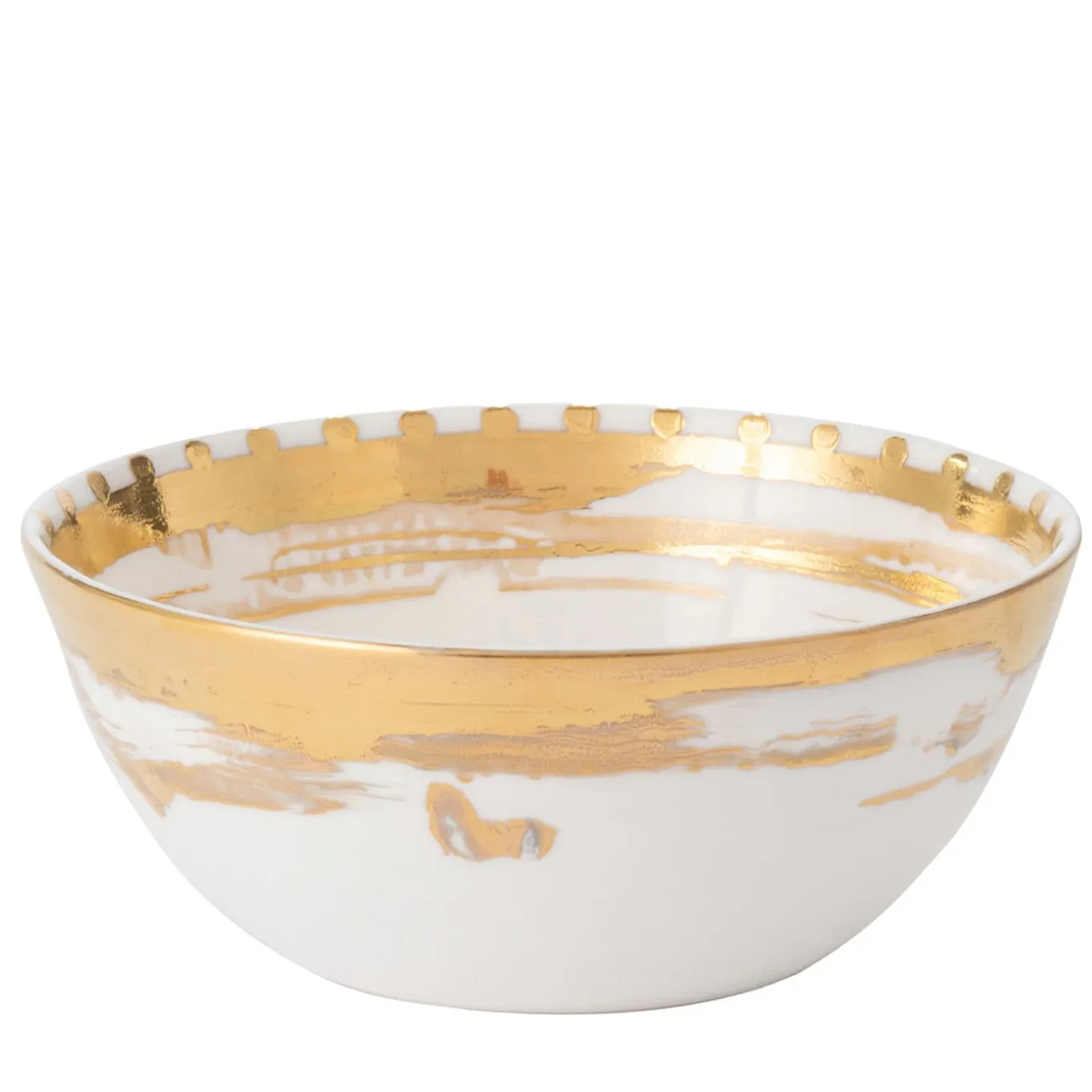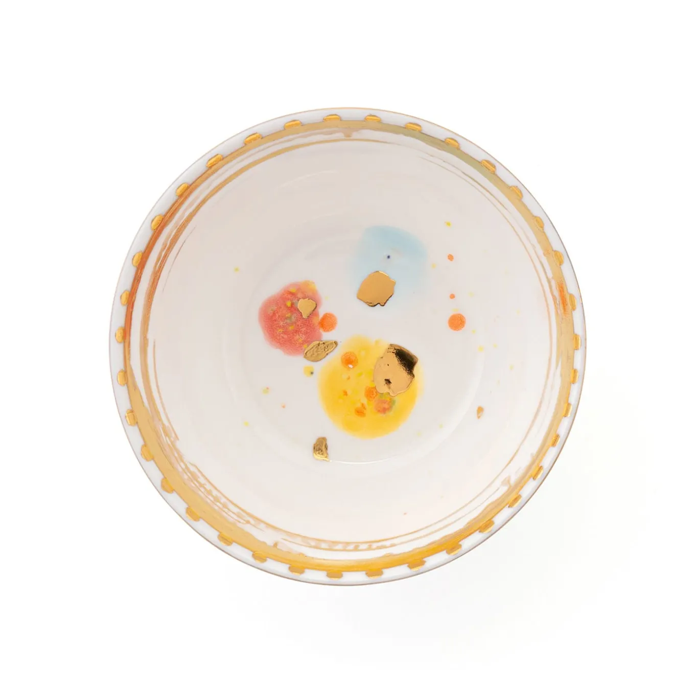 Recalling the splendor of Baroque art embodied by Caravaggio, this superb set of two porcelain fruit bowls is minutely crafted and decorated by hand. The combination of red, yellow, and light blue spots create a lively decoration ennobled by the presence of a gold leaf garland along the rim for a shimmering touch that is sure to fascinate. Any difference from the picture is to be expected and cherished.