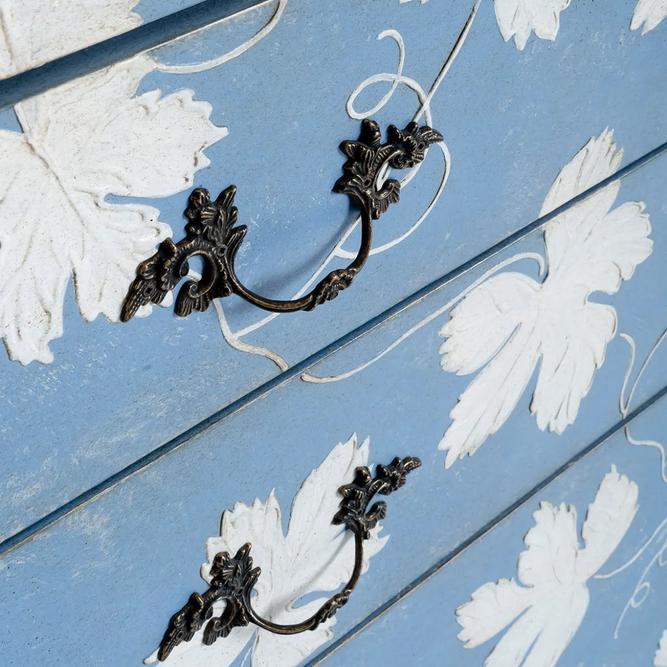 Introducing Ca’Rezzonico Chest of Drawers. Crafted with spacious and wide drawers, this piece offers both functionality and style. The solid frame is beautifully enhanced with a parma blue background color and textured vines in chalky white, adding a touch of elegance to any space. Customizable in size and design, the Ca’Rezzonico Chest of Drawers is a versatile and timeless addition to any home. Please, ask the Concierge service for further information.