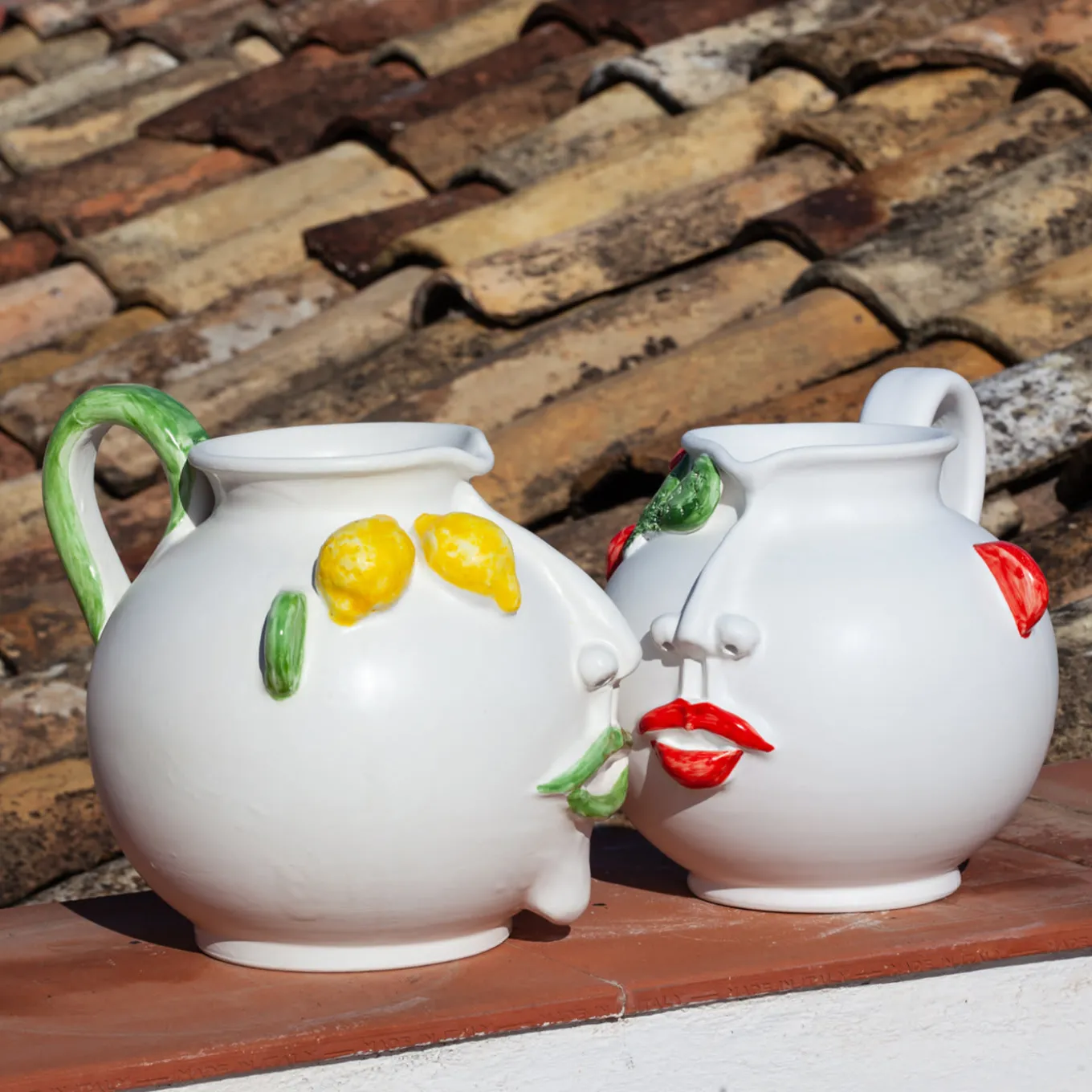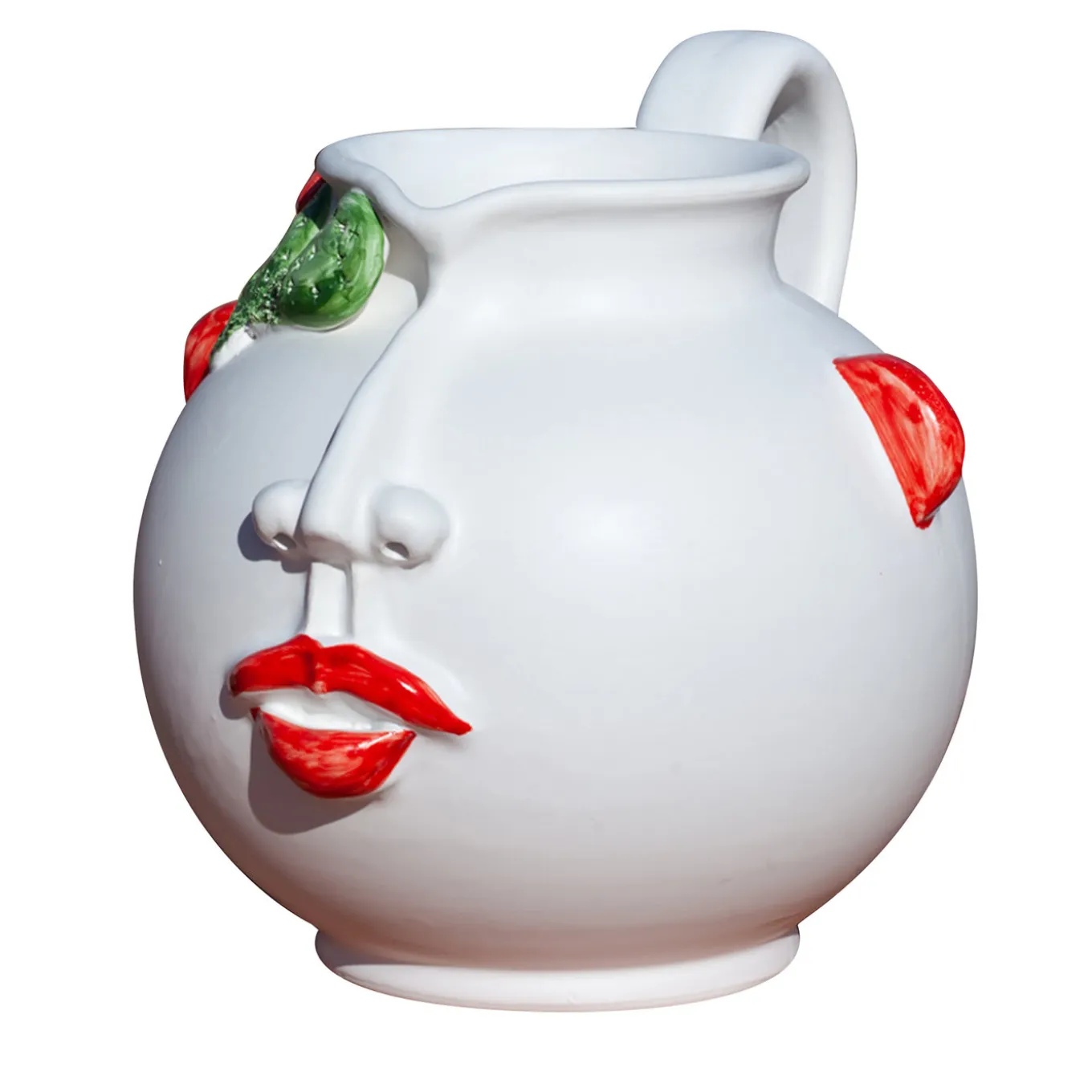 Handcrafted of matte-white-glazed ceramic by Patrizia Italiano as a tribute to the inebriating folklore of Sicilian local markets, this anthropomorphic pitcher boasts a generous silhouette embellished with colorful enamels accenting its traits. Its ironic design is sure to uplift any table setting or kitchen decor, decorations of prickly pears showing coherence with the fruits sold by Carmelina, street vendor after which the design isamed.
