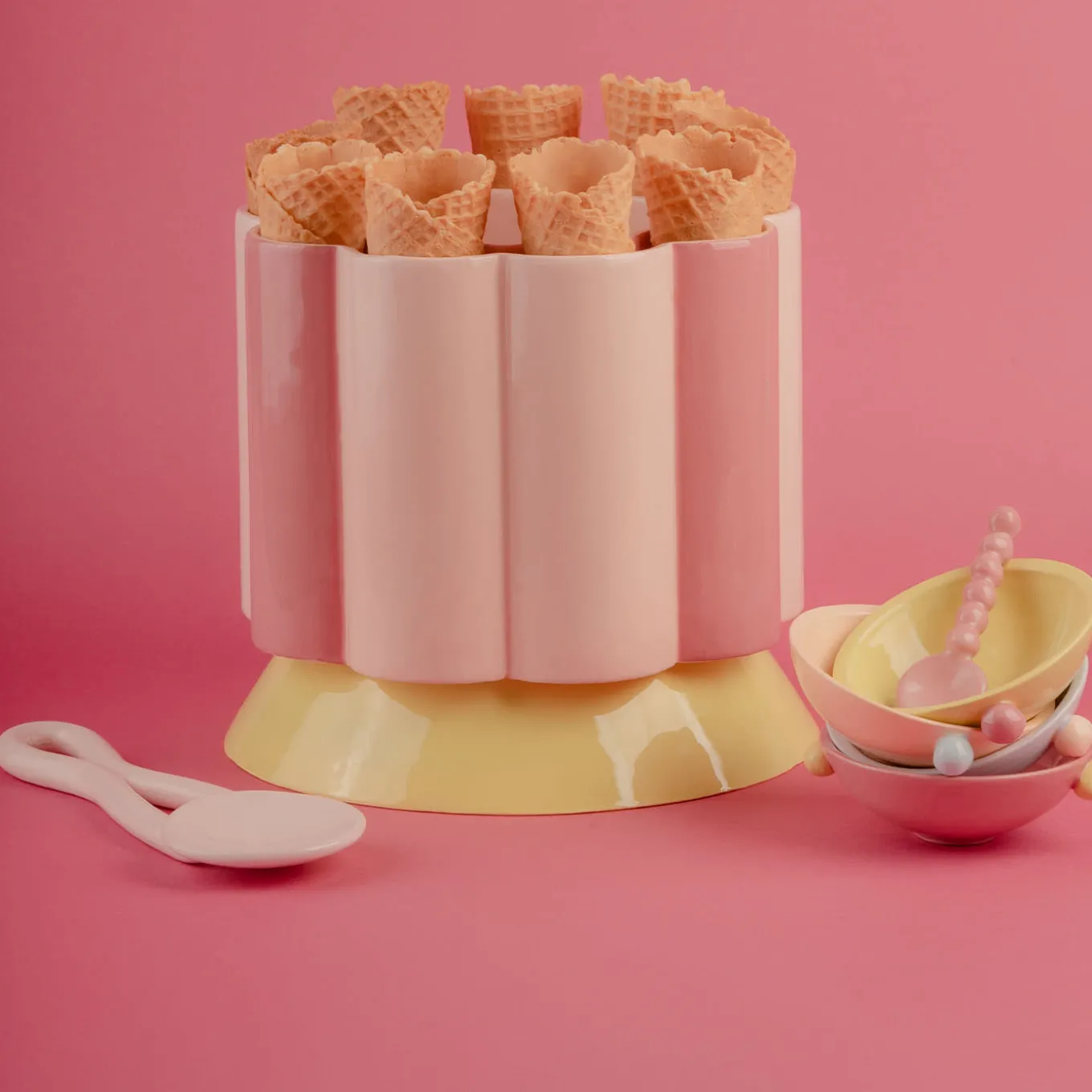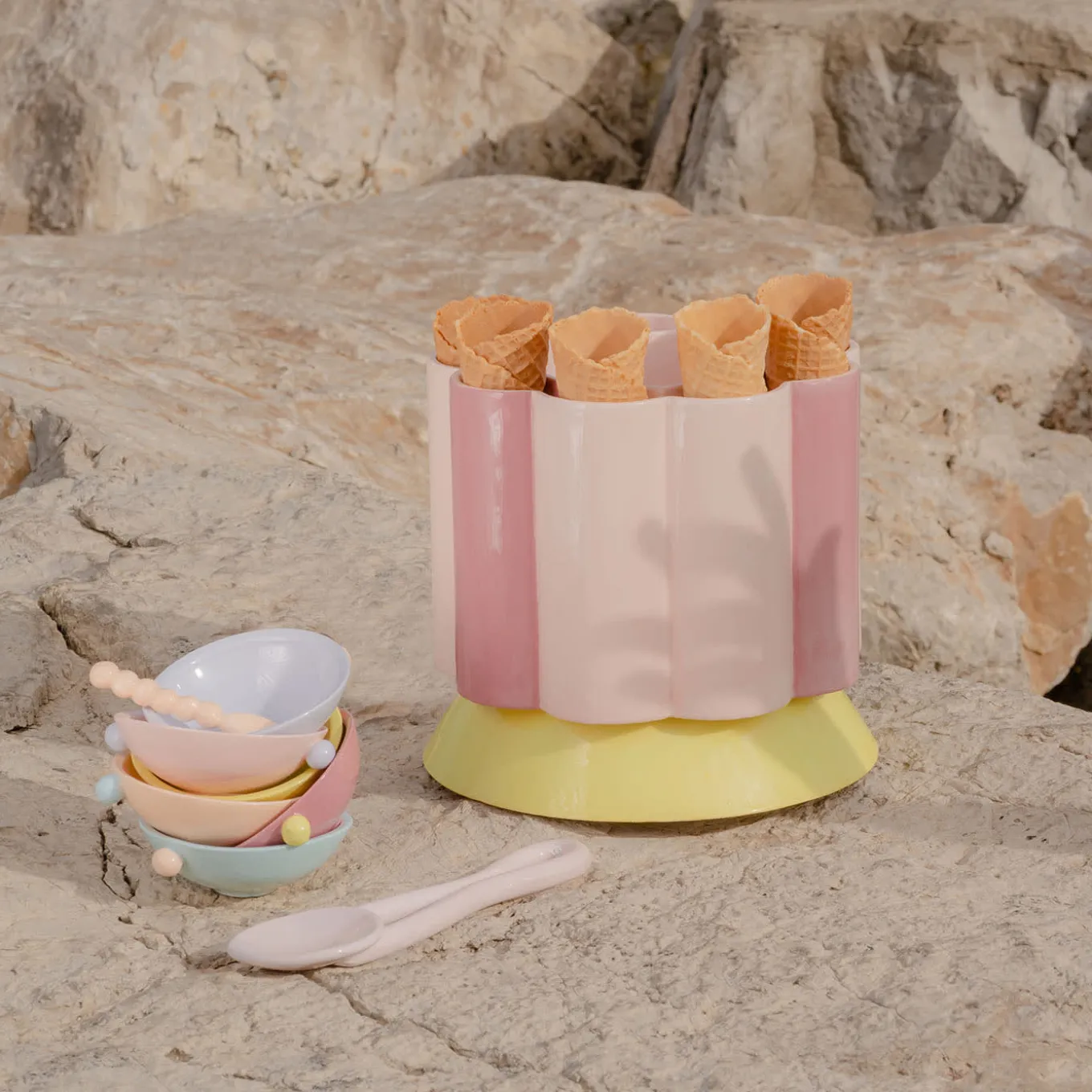 This large cup, which doubles as a tray, features a distinctive embattled design. Made of multicolored ceramic, it has a series of cavities that can hold multiple cones, allowing you to create a lively ice cream carousel. The central section of the cup is perfect for storing cups and can later be used to serve the ice cream. Carosello was created for Eleit through a collaboration between journalist and cookbook author Alba Pezone and designer-craftswoman Arianna De Luca, both passionate advocates of Italian culture.