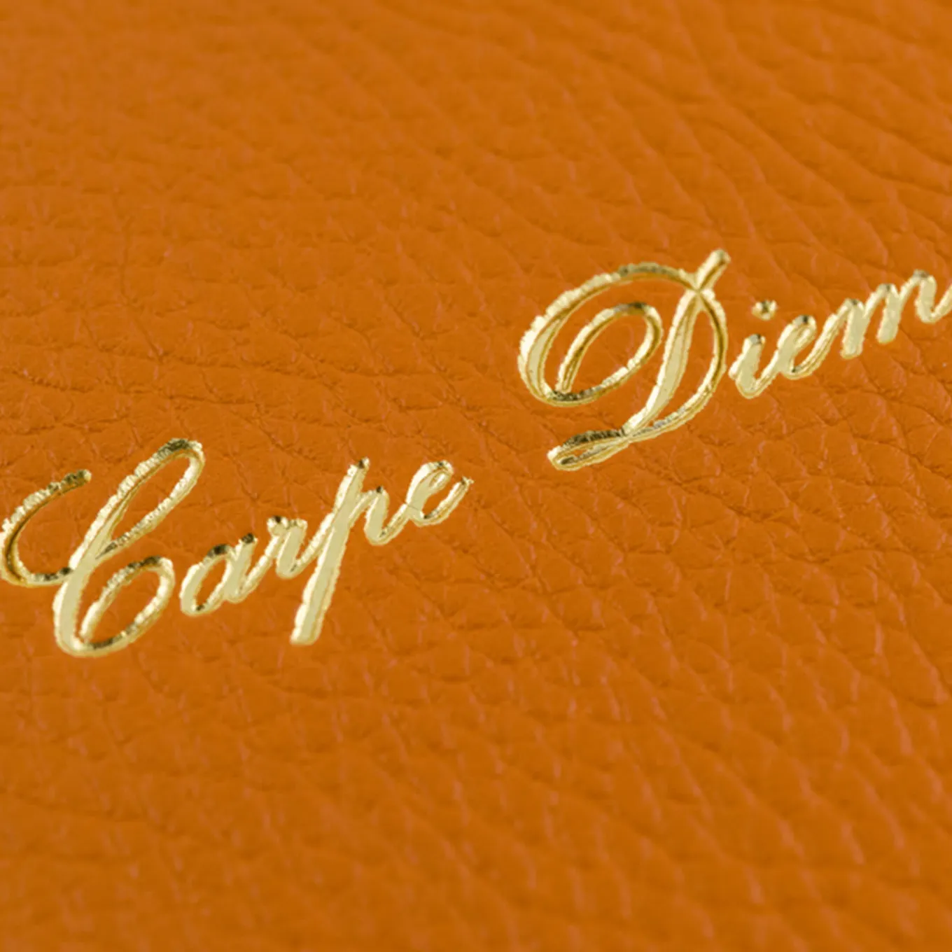 This journal is perfect for writing down anything — from your deepest desires and imaginative musings to your loftiest goals. It contains ivory-colored, acid-free pages and features a soft, naturally tanned, full-grain cover with the words Carpe Diem in gold. Ivory-colored dust bag included. Can be personalized with a monogram or name.