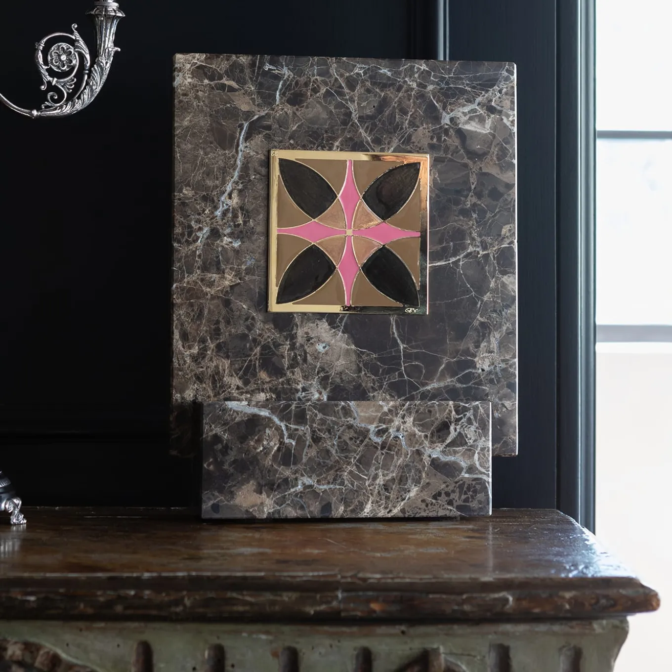 A luxurious and rigorous frame in prized Emperador Dark marble welcomes the tiny “tile” heart of this decorative piece with enamel on brass. The floral-inspired subject it showcases is obtained by following the ancient Cloisonné technique where metal strips or filigrees create cells – cloisons in French – inside which enamels get poured. Entirely handmade and unique, it belongs to a rich series of similar designs.