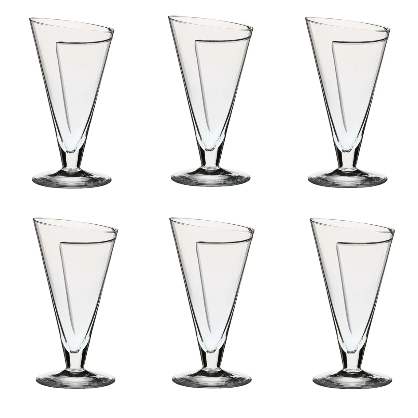 Named after its paper-cone shape (“cartoccio” in Italian), this magnificent set of six wine glasses was designed by Carlo Moretti in 1983. An exquisite and refined set created using traditional methods, these mouth-blown Murano glasses boast geometric etchings made by hand using a diamond grind and entirely finished by hand.