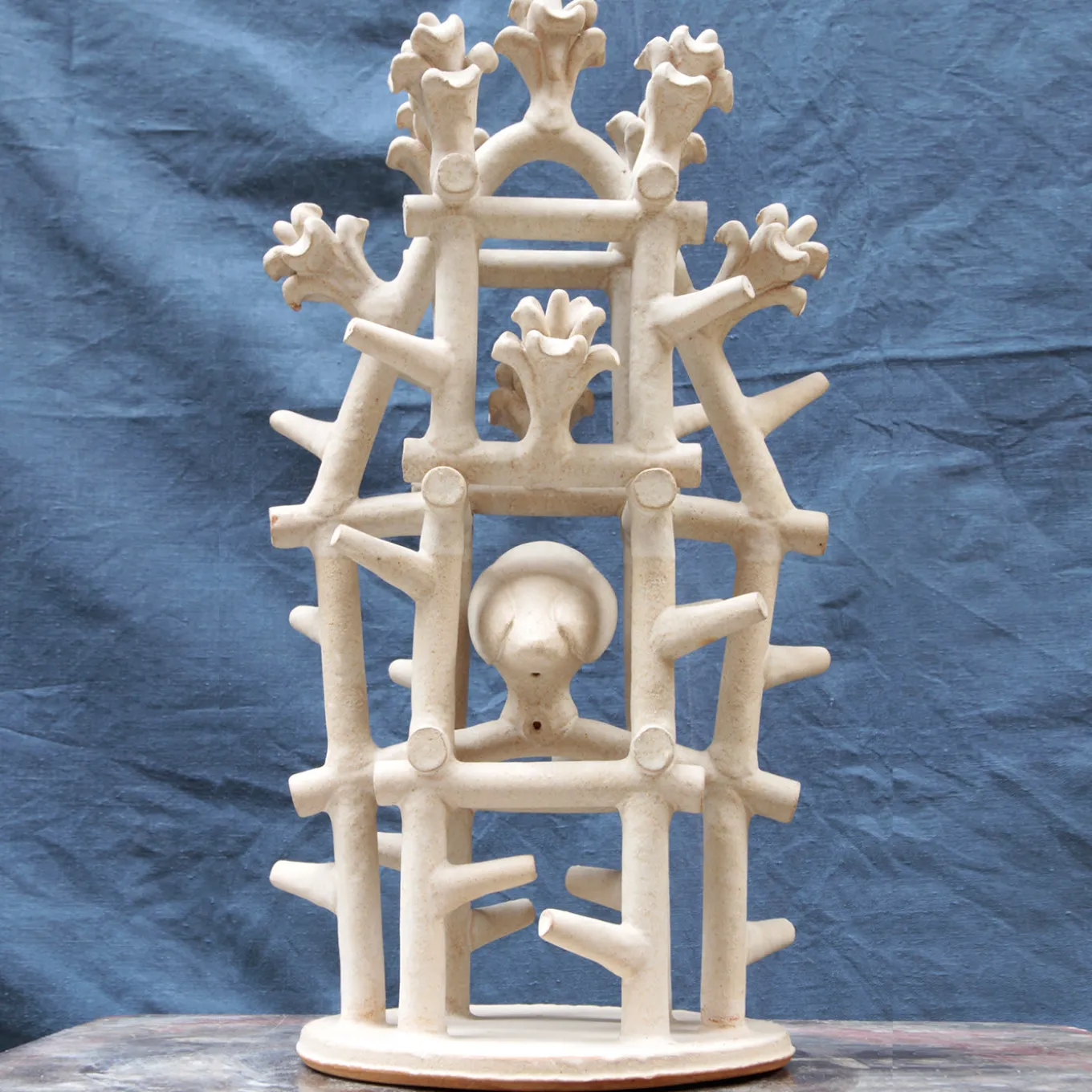 This exquisite ceramic sculpture is cooked at 2190 degrees Fahrenheit, then finished with cinder-based enamels. This one-of-a-kind piece represents a small natural temple inside a forest. In Greek mythology, the owl used to follow the goddess Athena.The bird also symbolizes wisdom.