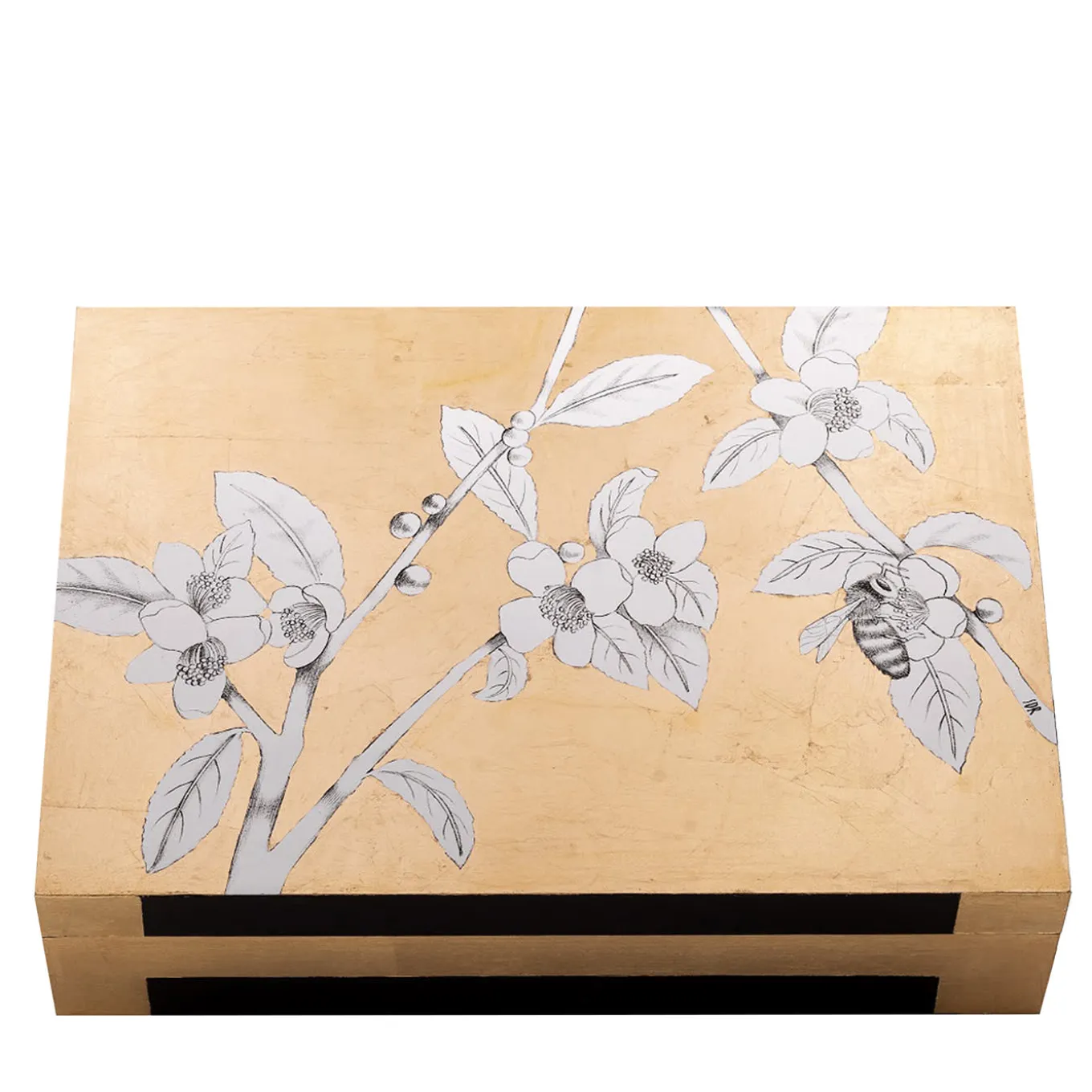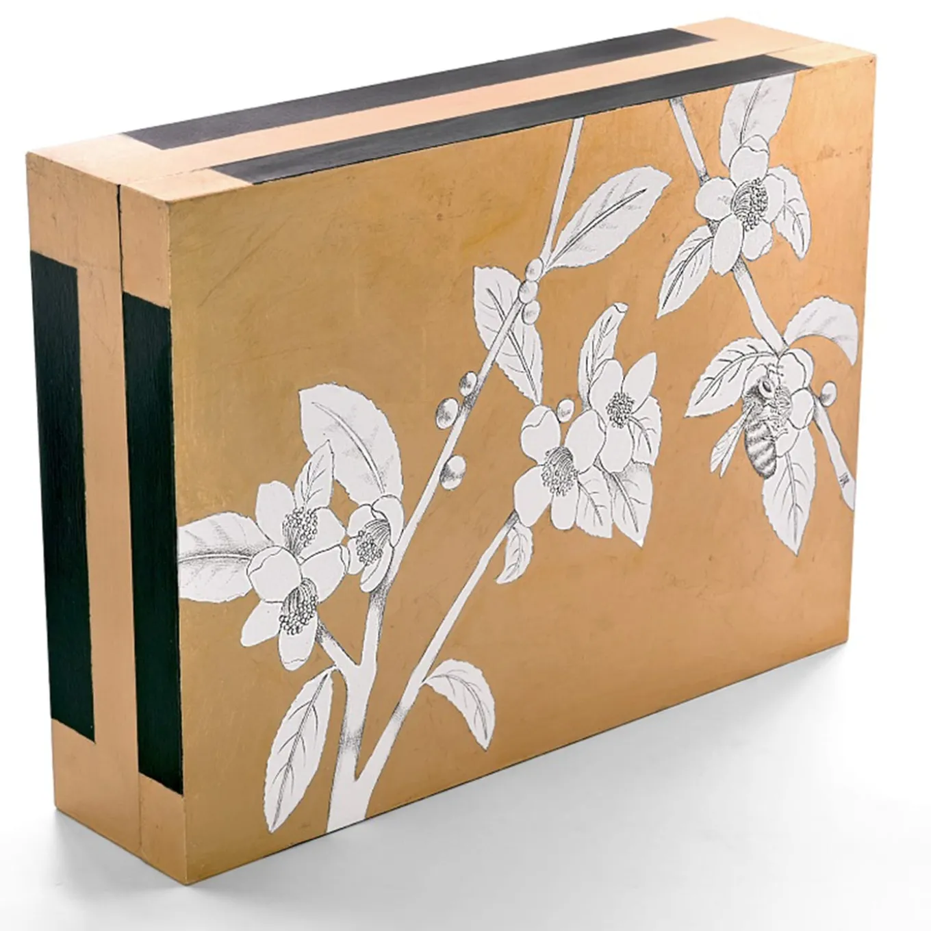 Hand-made box with gold leaf application on graphite drawing. A bee flies from tea flower to tea flower in a gold-sprinkled sky, made by Stefania with her masterful brushstrokes. Entirely decorated by hand with gold leaf on the print of an original graphite drawing. Finished with shellac. The interior is lacquered.