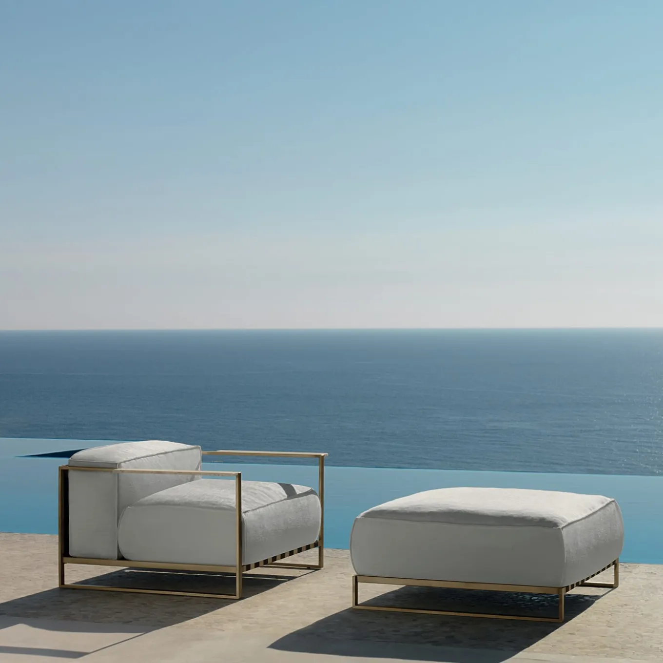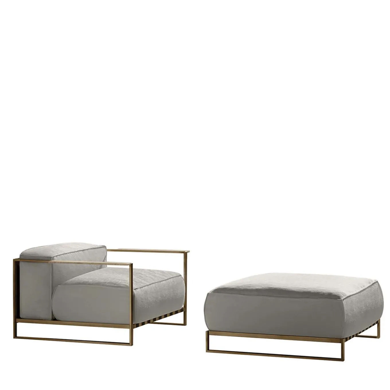 Opulent and classic, the Bauhaus-inspired style of this armchair and pouf makes it a perfect seating accent in both modern and minimalist decors. Boasting a light and airy frame of gold powder-coated stainless steel, the padded cushions of both pieces have a removable cover of white fabric that evokes the white Carrara marble detail on the armrests of the armchair. Supported by polyester belts, this two-piece set provides comfort without sacrificing style and a dynamic, functional accent suited for all indoor and outdoor settings. Ask the Concierge for other available colors and finishes. Contract and commercial certifications available upon request.