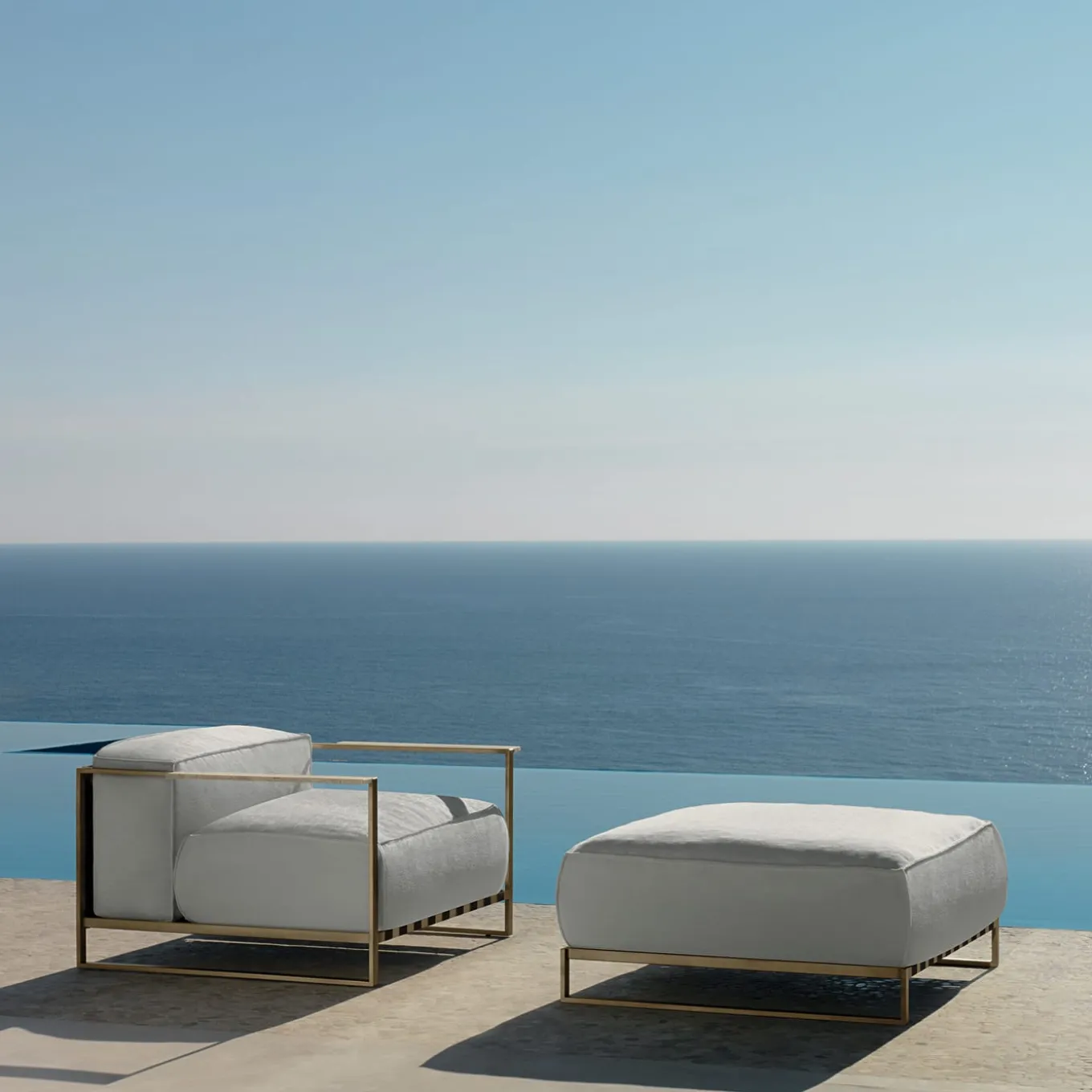 A modern piece of functional decor, the sculptural base of this pouf is handcrafted of stainless steel with a striking gold powder-coated finish. Combining materials with contrasting textures and colors, this pouf has a sophisticated modern feel. The generously padded seat is supported with polyester belts and upholstered with a removable cover of white fabric that is whether resistant and washable. Its versatility allows for pairing with a myriad of indoor and outdoor decors and styles. Contract and commercial certifications available upon request.