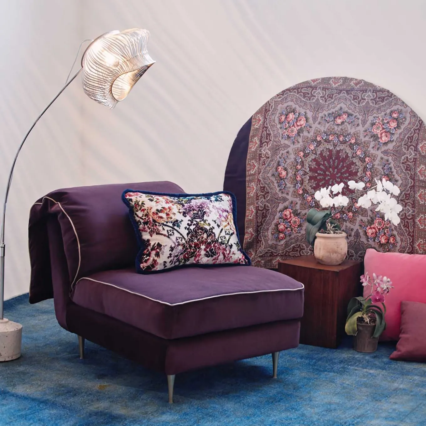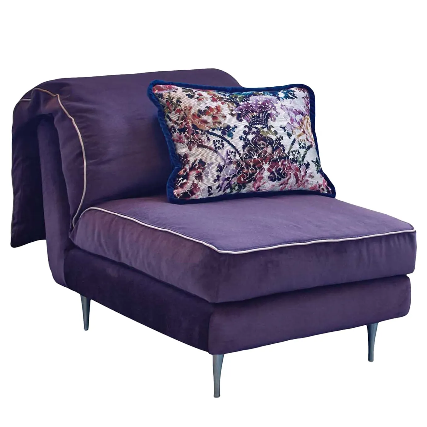 This harmonious and extremely compact daybed proposes a plush design with a fold-up back cushion to enjoy moments of authentic relaxation. With four polished aluminum feet. The luxurious upholstery is accented with contrasting details. Designed by ddp Studio. All materials used are 100% natural and biodegradable. Entirely handmade. The cover is removable. Different options are available. The decorative cushion is not included. Please contact the Concierge for further details.