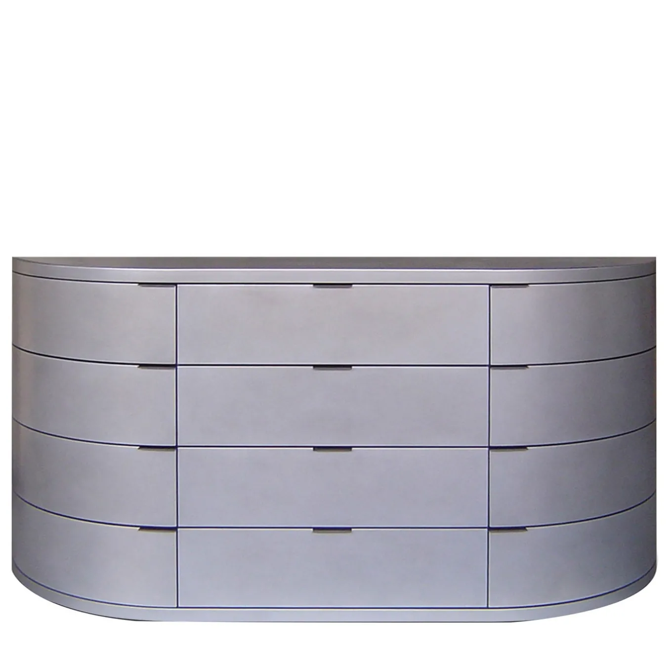 This chest of drawers has a central straight element and rounded sides with metal handles. The external drawers are easily accessible thanks to a special rotating system. All versions have glossy bronze shagreen-printed leather inside the drawers. Please contact the Concierge for other information.