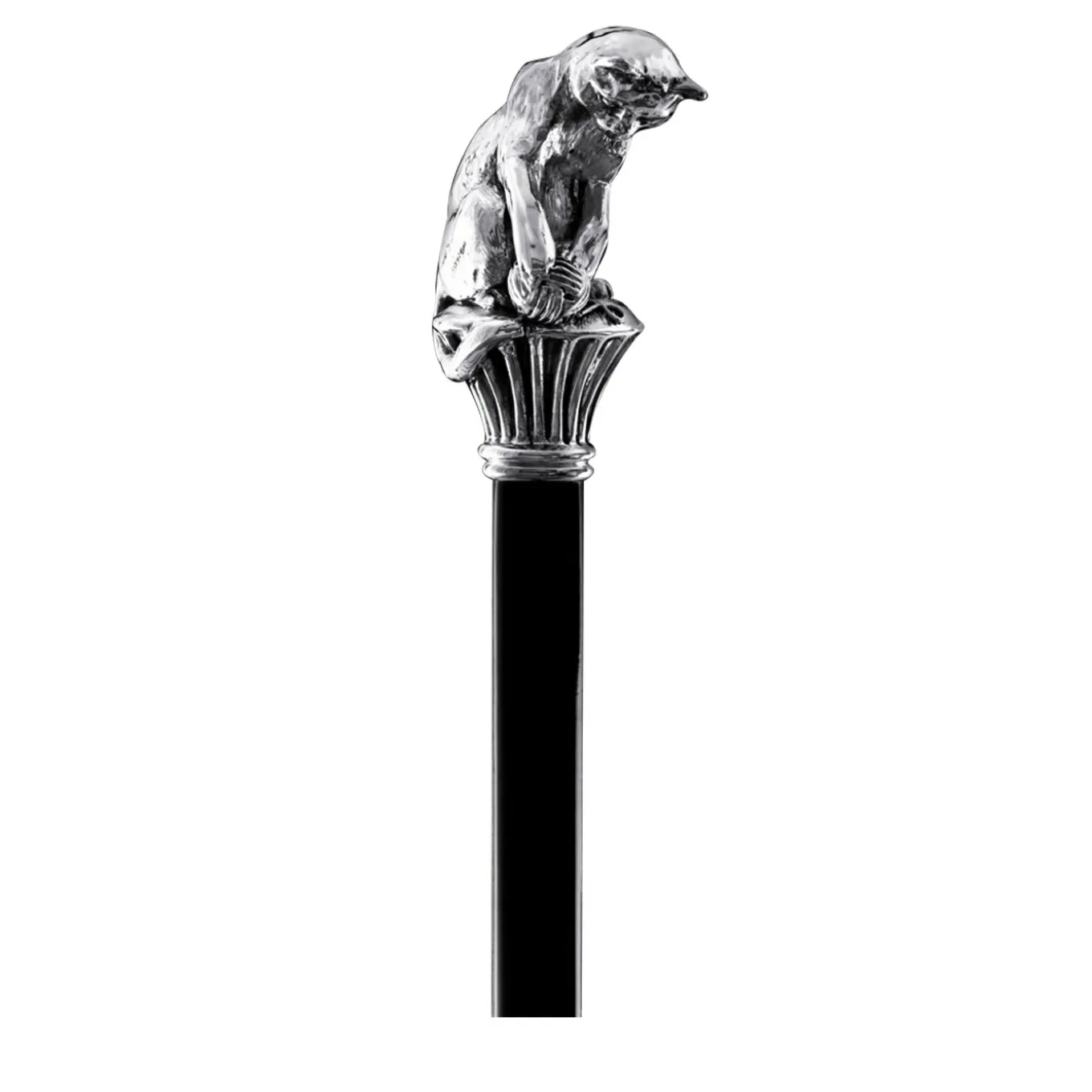 Characterized by an elegant and classic design, this stick features a metal handle richly decorated with elegant patterns embossed on the surface. The conical shaft of this sophisticated accessory is crafted in gloss black beech wood and has a silver-plated brass tip with protective rubber end. This is a collectible item, not to be used for walking.
