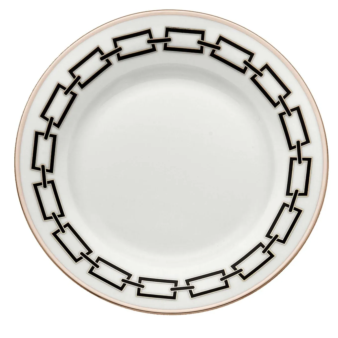This stunning set of six dessert plates will enrich an after-dinner dessert or an afternoon tea, where it can be combined with other items in the same Catene collection for a cohesive look and magnificent effect. Crafted entirely of porcelain, each piece boasts a pure white background delicately adorned with a geometric decoration in black, with a rim in gold. This stylized chain-like decoration was created in 1926 by iconic designer Gio Ponti and elegantly combines traditional aesthetic and modern sensibility.
