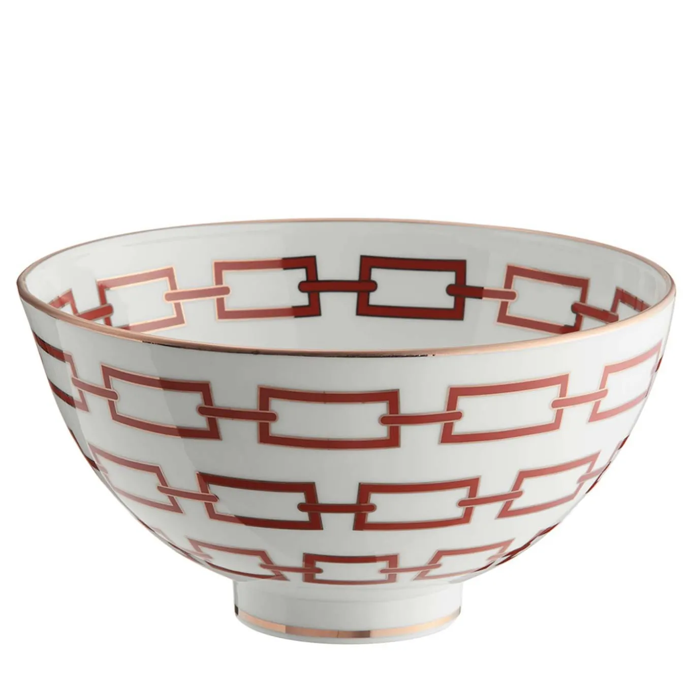 This elegant bowl is part of the refined tableware collection Catene, inspired by the creative genius of Gio Ponti and his drawings from 1926 reproducing the pattern of chains (hence the name in Italian). Entirely crafted of porcelain, its white background is adorned with a scarlet-red version of this geometric pattern that elegantly complements the gold rim marking the round shape of the piece. Versatile and modern, this bowl can be combined with the other items in the same series for a cohesive display on a refined dining table.