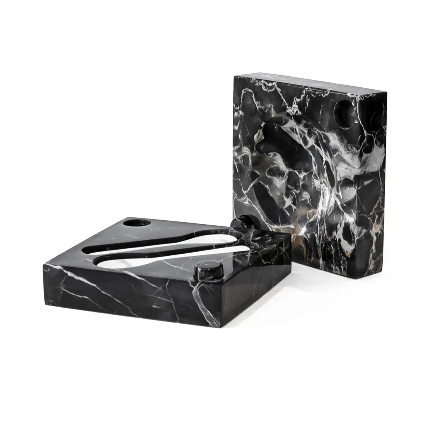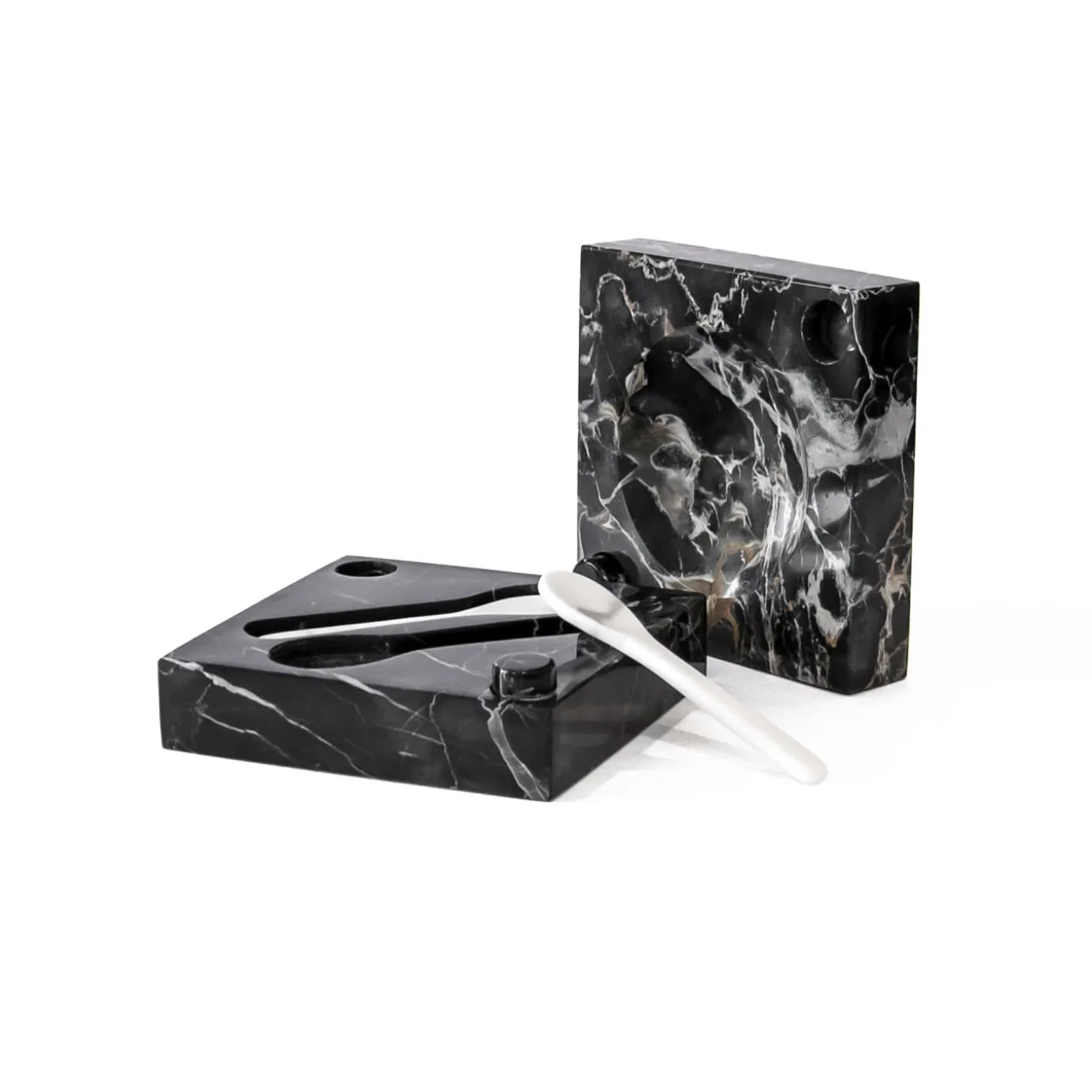Caviar holder with spoons in Portoro and white Carrara marble. Each piece is in a way unique (every marble block is different in veins and shades) and handmade by Italian artisans specialized over generations in processing marble. Slight variations in shape, color, and size are to be considered a guarantee of a handmade creation. It’s important not to use lemon or vinegar on it, clean only with water and natural soap (like Marseilles soap), do not put it in the dishwasher.