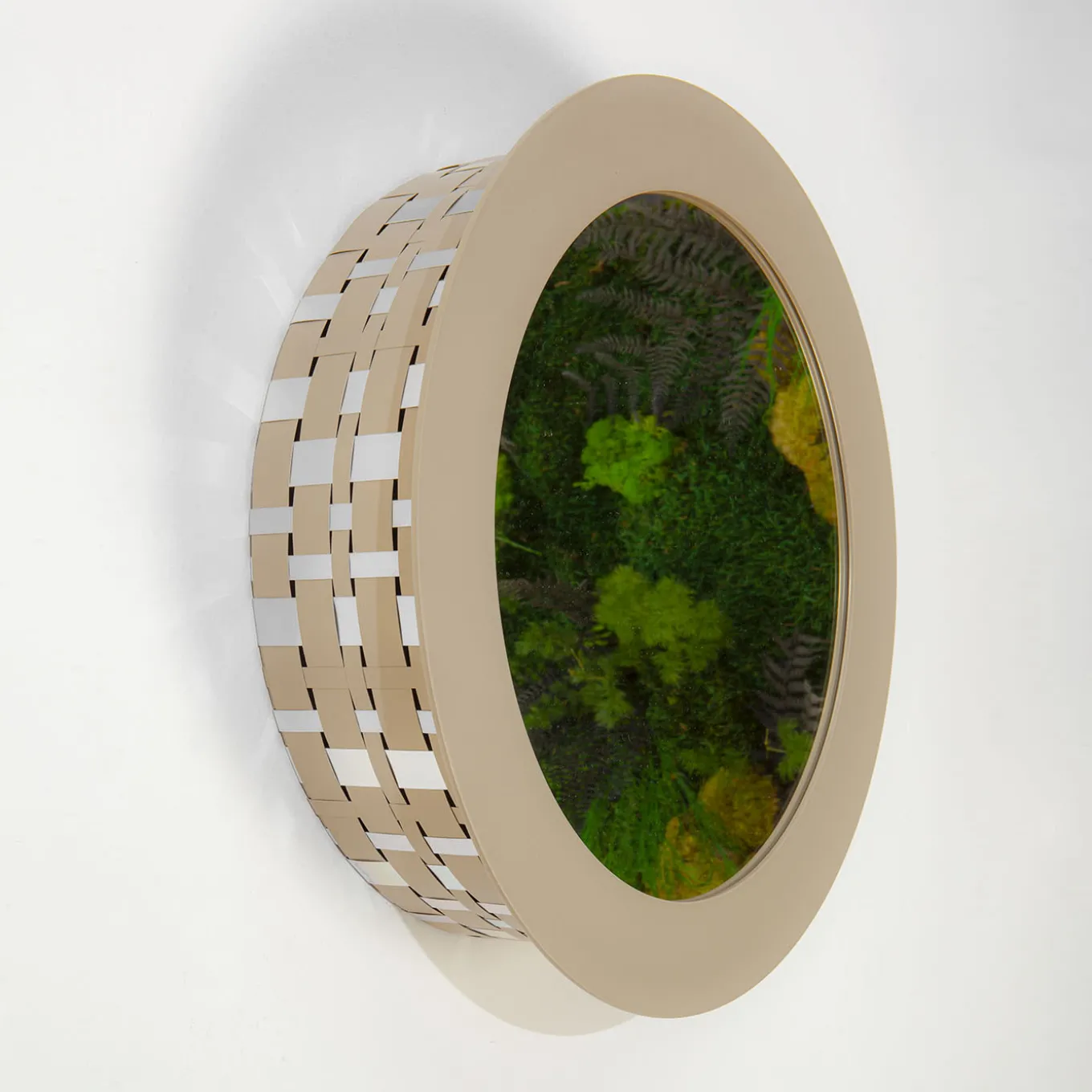 Functionality meets aesthetic in this exclusive round mirror. The bold SPLOT® – high-grade aluminum foil – frame showcased in an elegant champagne-gold finish stands out for its captivating mesh combining a solid champagne-gold half with a champagne-gold and silvery half enriched with a captivating optical effect. Patiently crafted by hand, each piece is entirely unique.