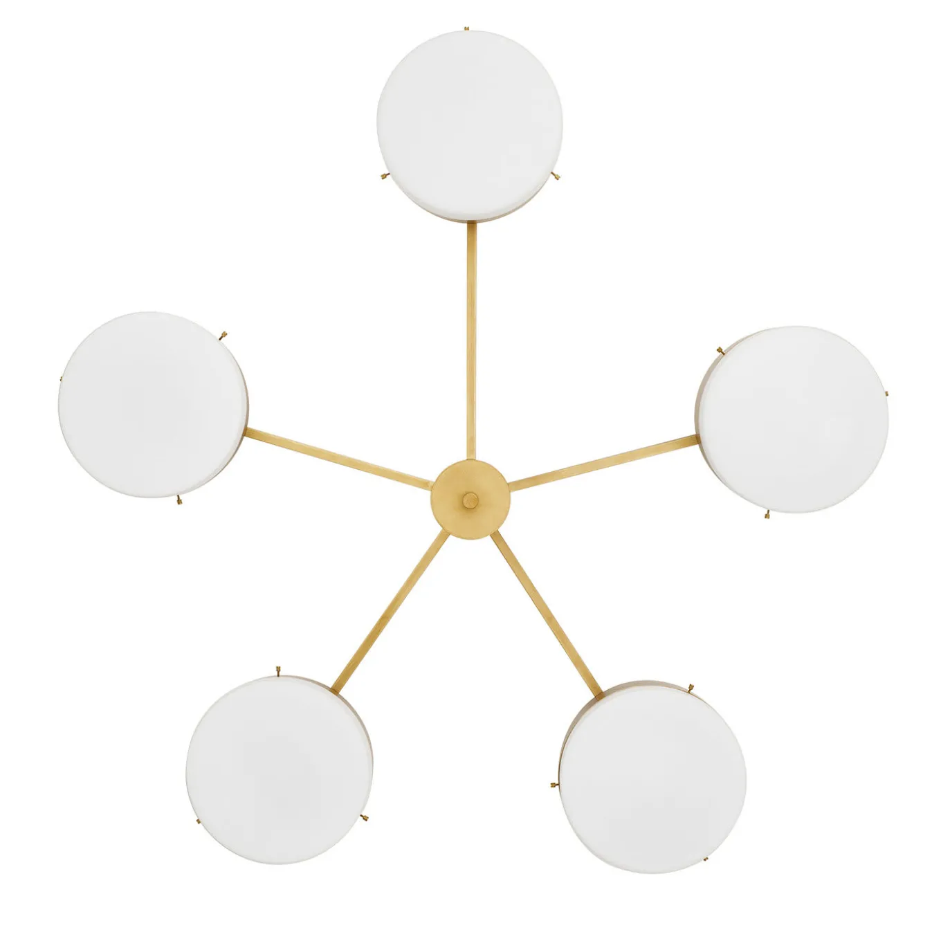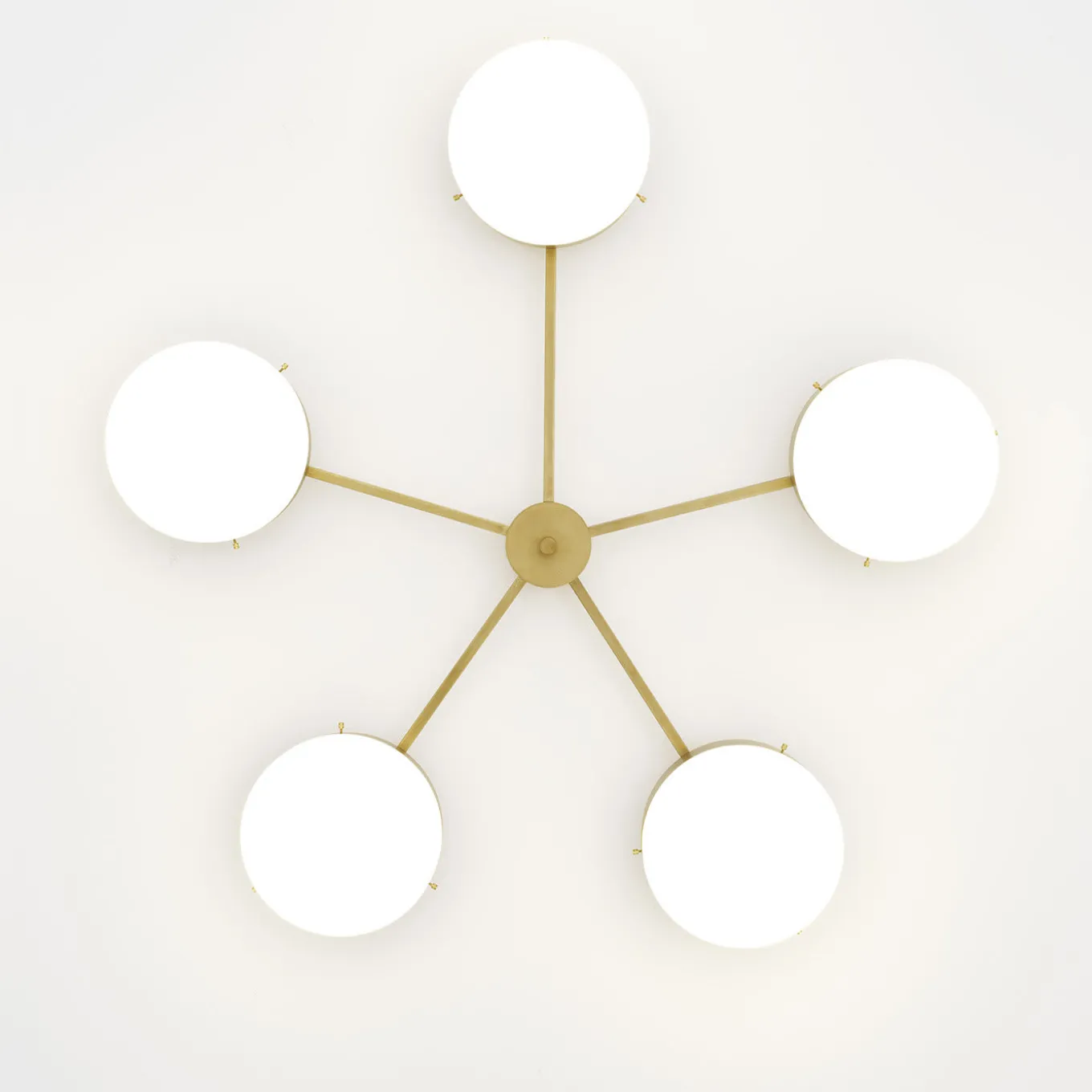 Named for its ethereal charm, this magnificent lamp will add a bold character to any wall or ceiling of a contemporary interior. Part of a series inspired by the image of an open window in the sky, it features a brass structure composed of five arms sustaining five round bright shades in opaline glass. Supporting incandescent or LED bulbs (not included), this piece can be wired for North America (110V 60 Hz – E26 socket bulbs) or Europe (220V 50Hz – E27 socket bulbs). Available in other finishes upon request, please contact the Concierge for details.