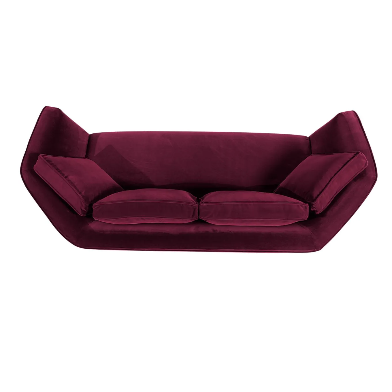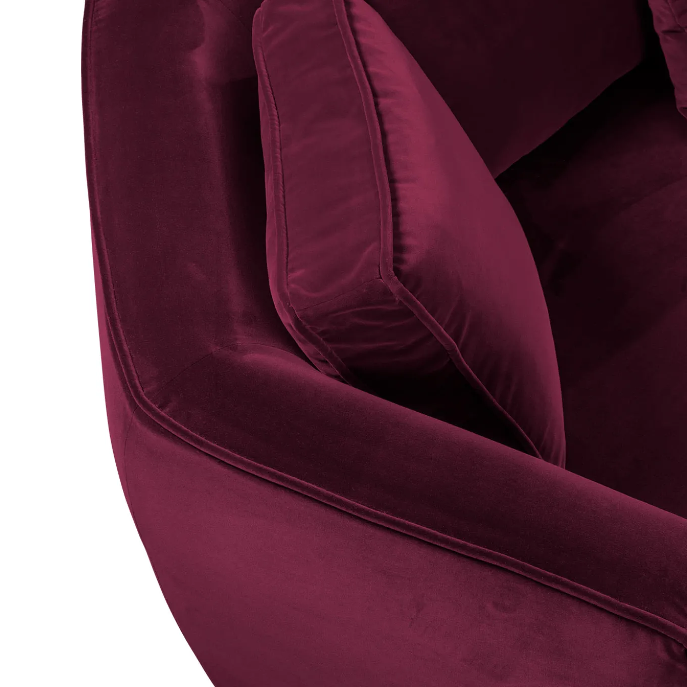 Exuding a refined classic style of utmost sophistication, this sofa will make a statement in both private living settings and in the hospitality sector. Upholstered with a non-removable red velvety fabric cover, it is made of solid wood and plywood, resting on a satin brass-coated wooden base. The fixed, welcoming seat is padded with high-density non-deformable polyurethane, while the backrest is filled with memory foam and enriched with goose down-padded cushions.