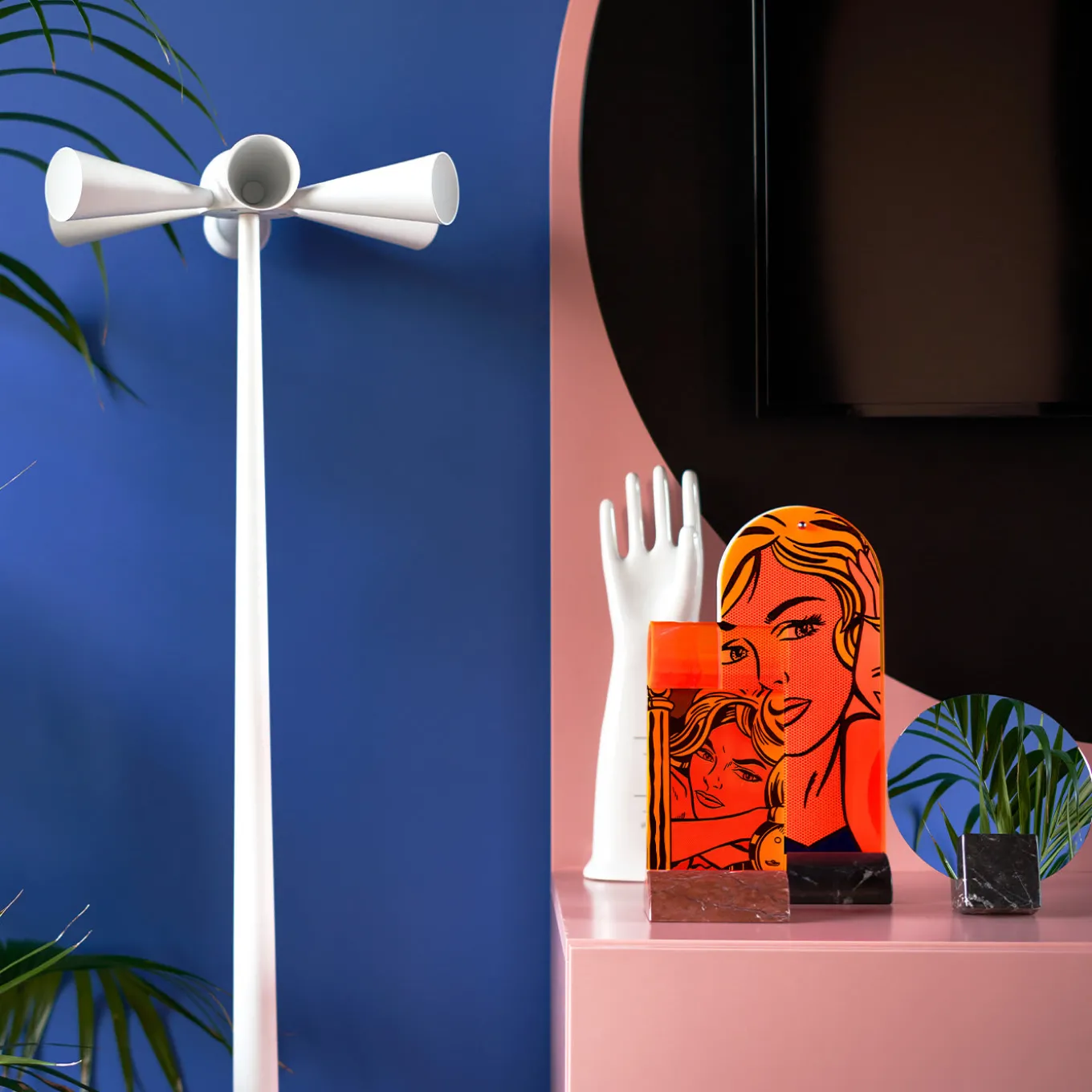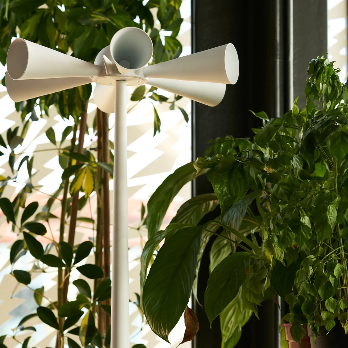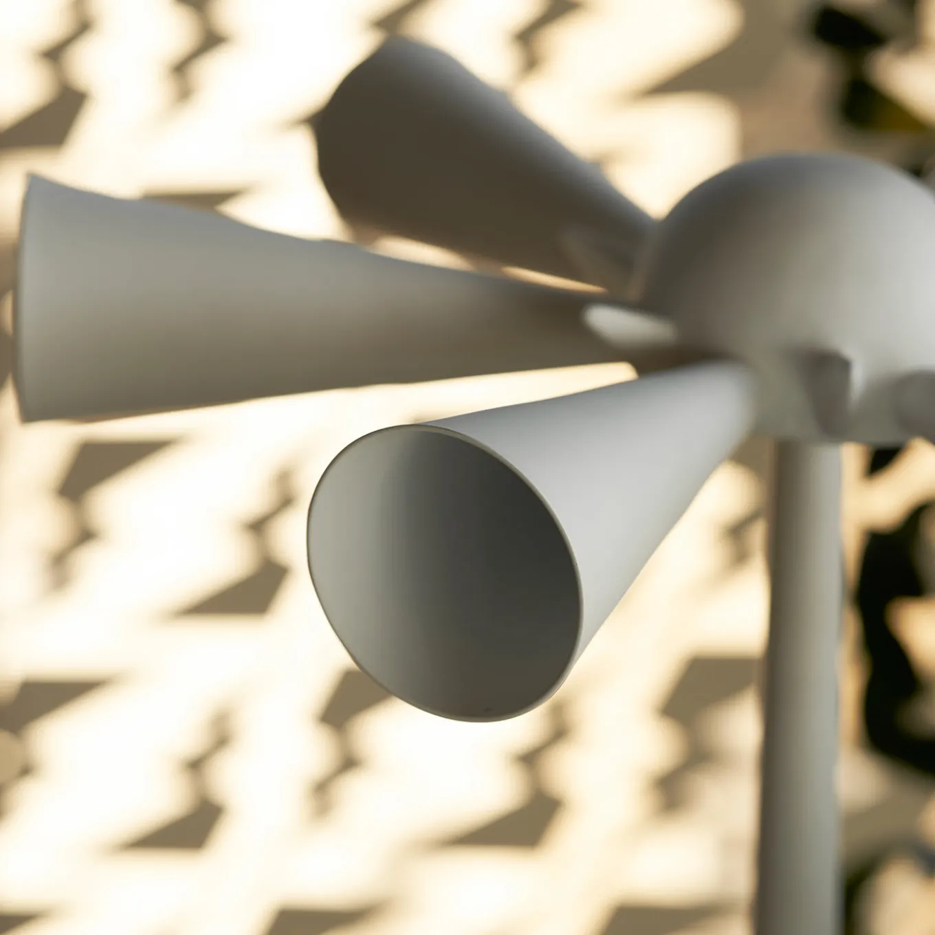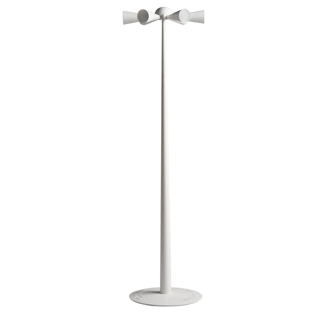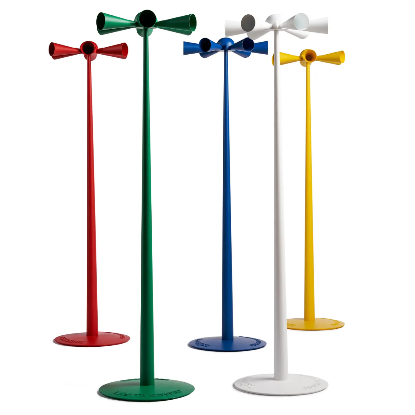 Designed in 1986 by DDL and launched by Poltronova in 1991, this coat hanger is named after its background concept: the Italian phrase for “Alarm Over”. Made of white-lacquered aluminum, it features a series of alarm trumpet-like hangers that remind the end of the war. Marked by a clean and cheerful modern style, it is completed with an iron stem and a round aluminum base, all finished with a white water-based lacquer.