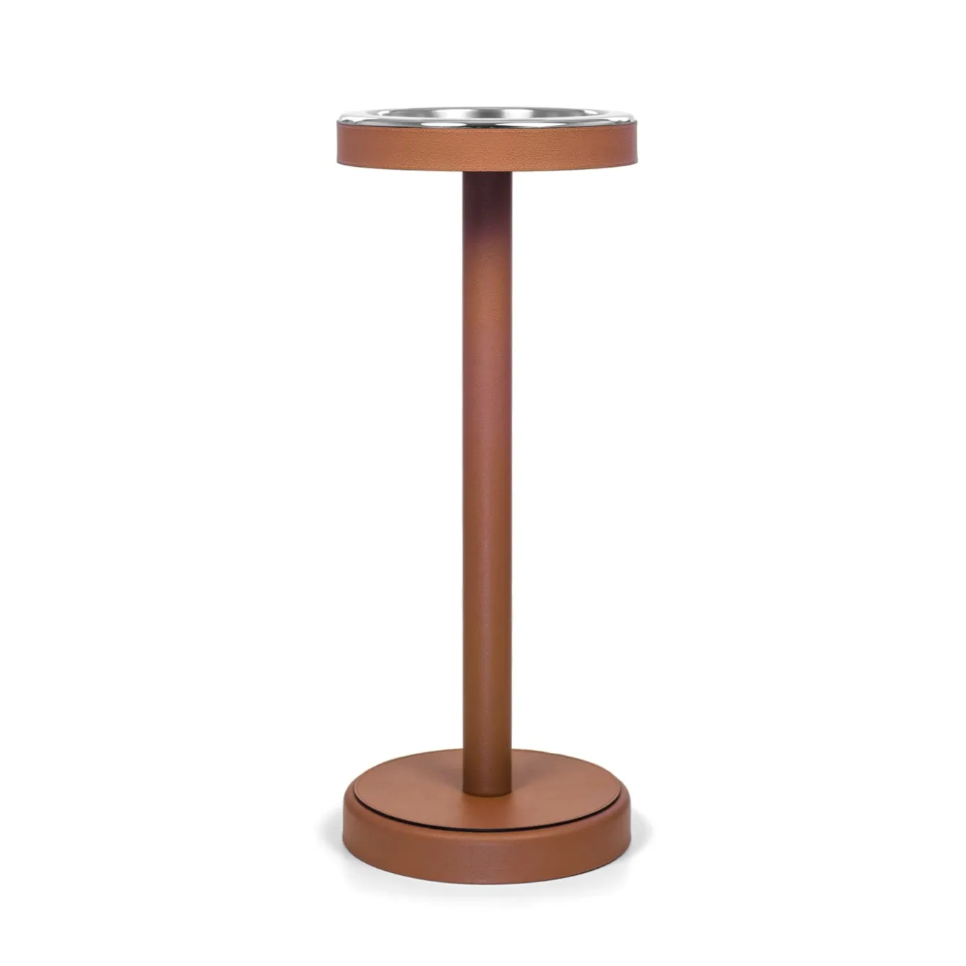 Clean and refined, this champagne ice bucket with a stand is a must-have design for a refined gathering of elegant presence. A prized object, it is crafted of metal covered with brown Liverpool leather. Also offered in a wide variety of colors and other leathers upon choice, please ask the Concierge for details.