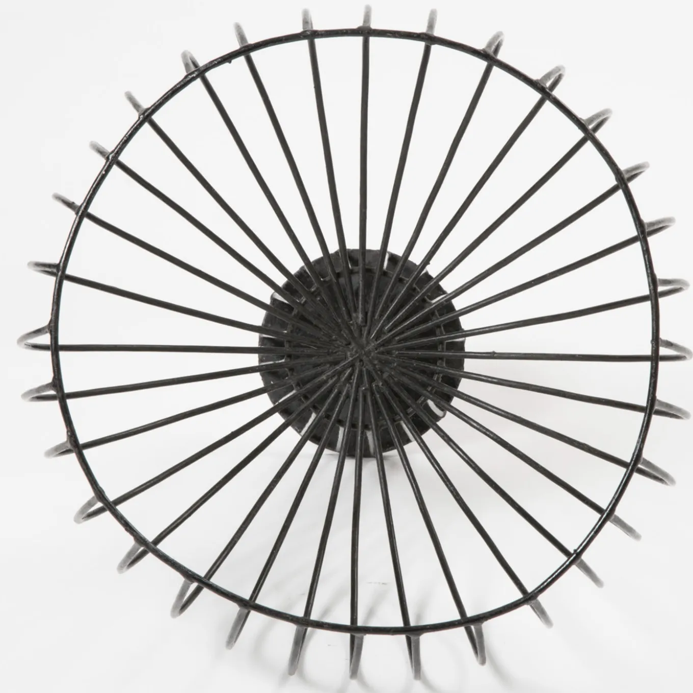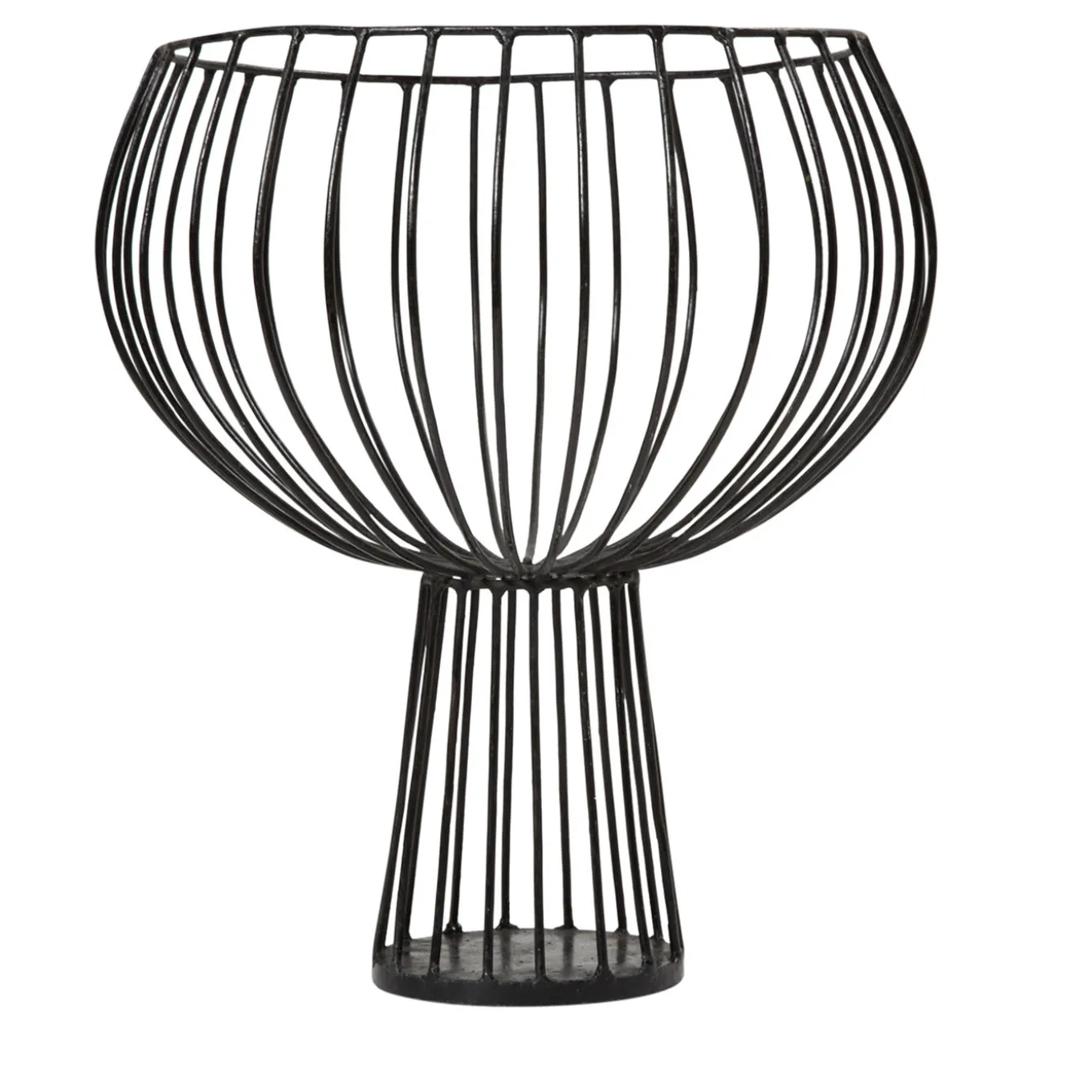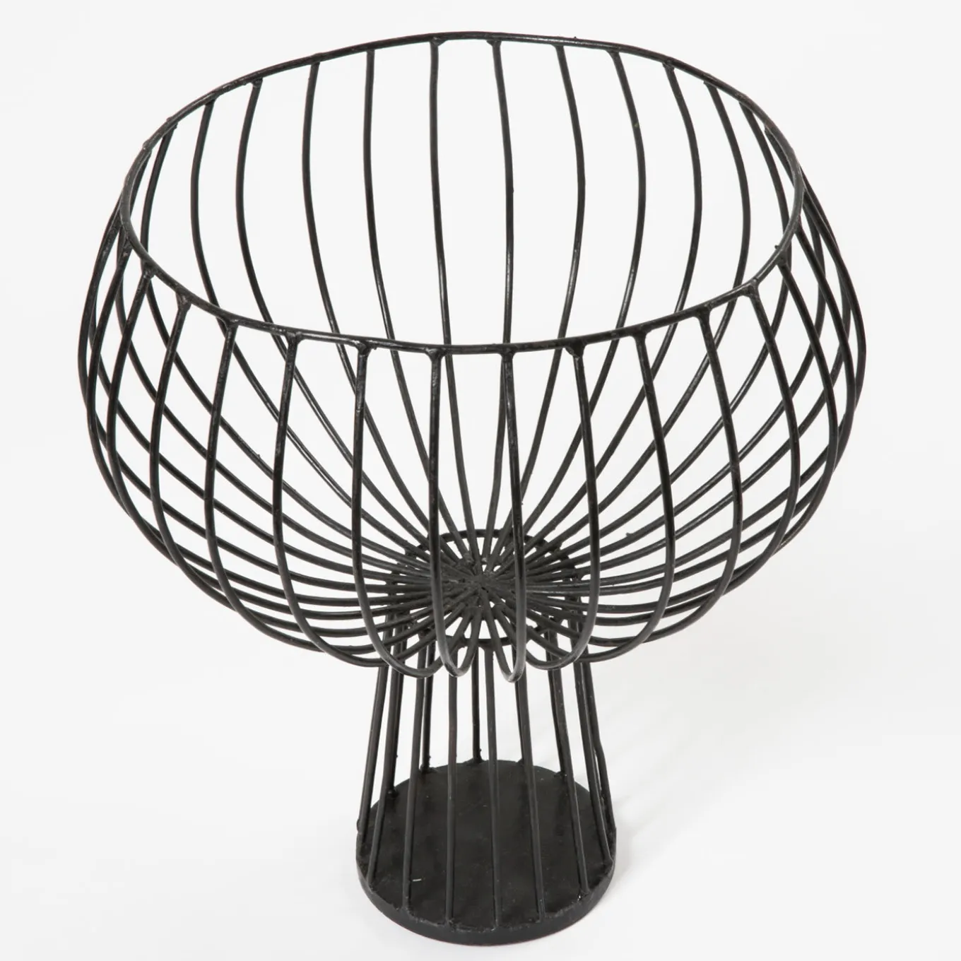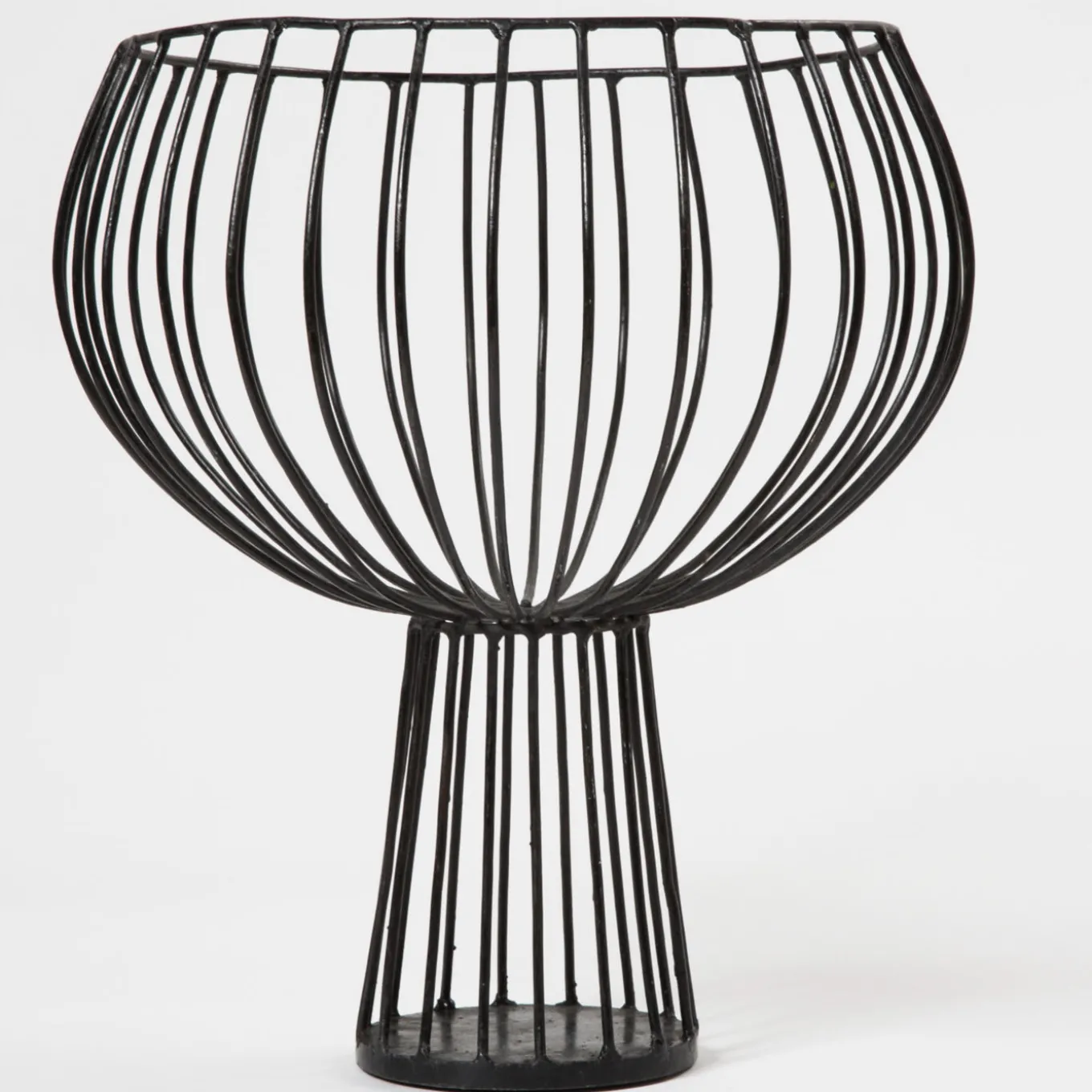 Elegant dome-shaped black vase made of galvanised iron wire, raised by a cylinder of the same material, with sunburst iron lines jutting out of the edge and bending on the sides. Occasional maintenance is advised by polishing with wax for wooden furniture.