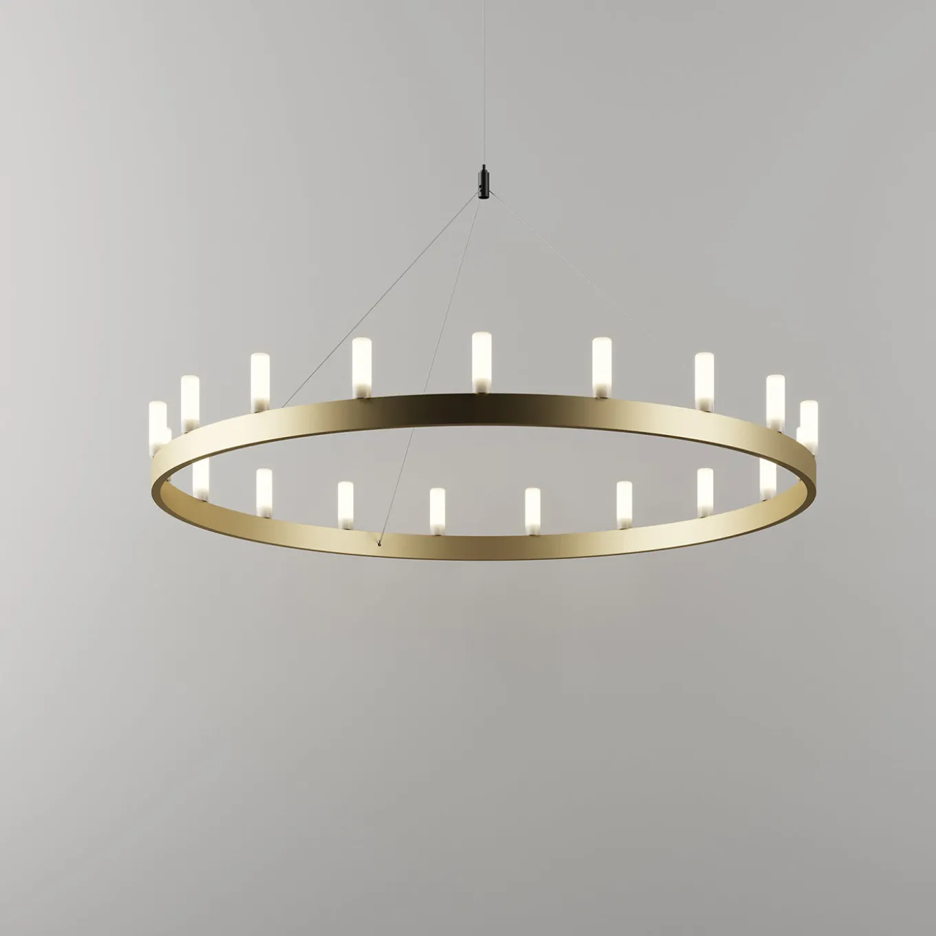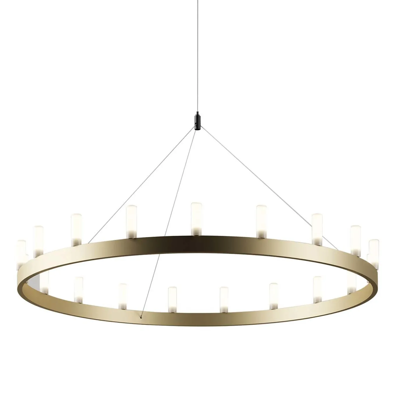 Reminiscent of the Medieval chandeliers, this piece by David Chipperfield is a modern and sculptural object of sophisticated allure. Also available in black, its metallic structure with a gold finish comprises a simple ring supporting eight 40W halogen ES E14 bulbs and 14 40W halogen ES E14. It is also available with a double ring and with a larger diameter (150 cm) with 14 40W halogen ES E14 and 19 40W halogen ES E14 bulbs. This item is only wired for 220V and it is sold with an adapter.