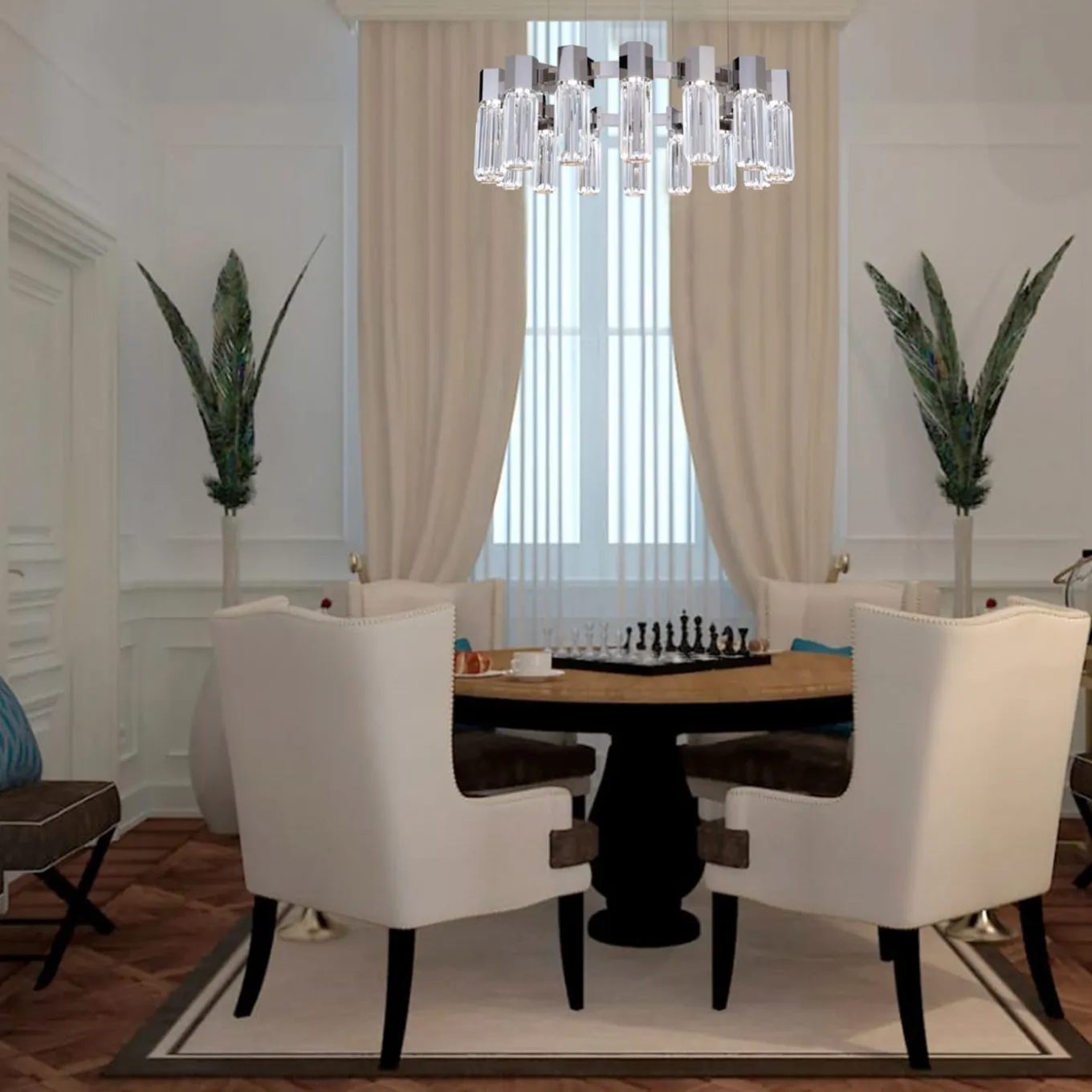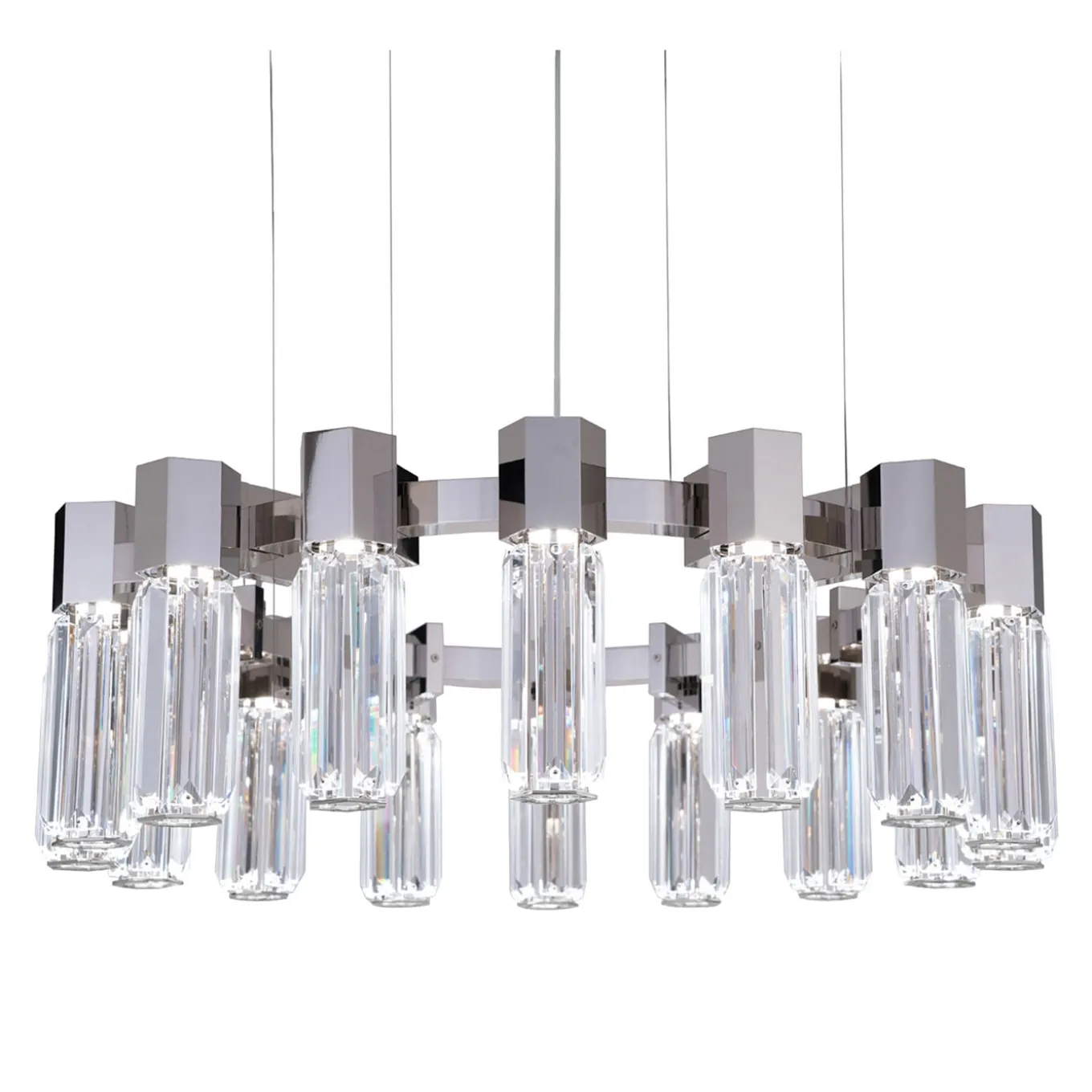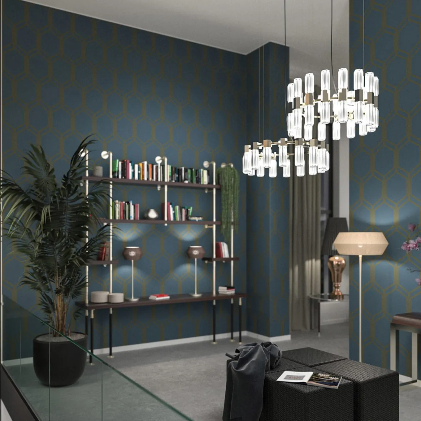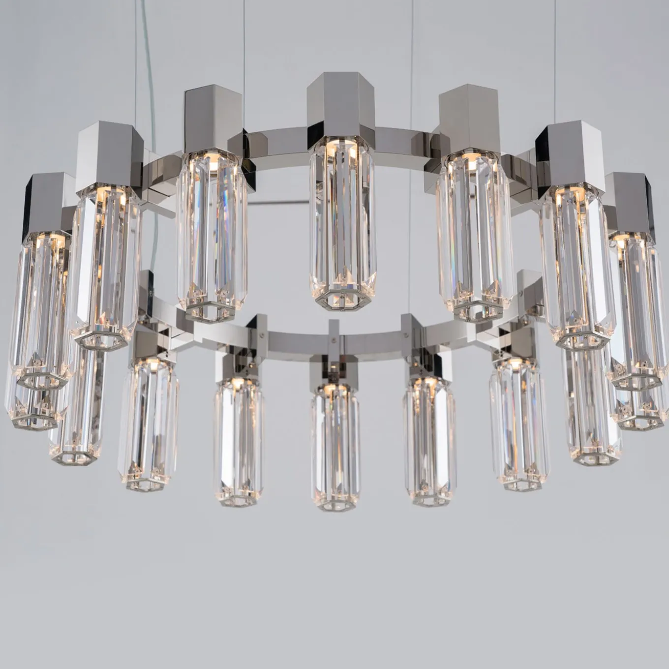 A calm chaos, elegant and composed. A stylistic system with structured tones where the real star is the hexagonal module. Its squared lines recount functional, aesthetic, and geometric storytelling. The name encompasses its most intimate essence: from a starting module, it can replicate myriad infinite forms, hence chaos. Led supplied. Bluetooth dimmer on demand. Available in custom sizes and finishes. Metal and crystals. Polished nickel and clear cut crystals.