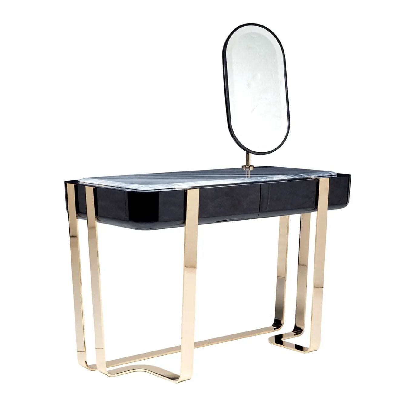 This exquisite vanity desk features a Black Bubinga burl veneer with a high-gloss polyester finish, offering a luxurious tactile experience. Its beveled Grey Alpi marble top adds a touch of sophistication, while the light gold chrome stainless steel legs with the Giorgio Collection logo provide a modern, elegant foundation. Designed by Castello Lagravinese Studio, the Charisma desk is the ultimate fusion of timeless style and contemporary functionality.