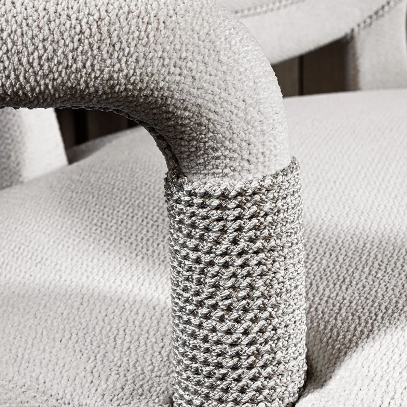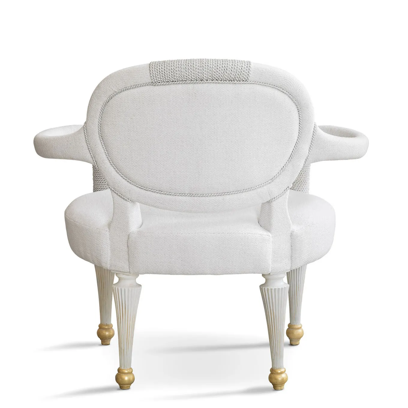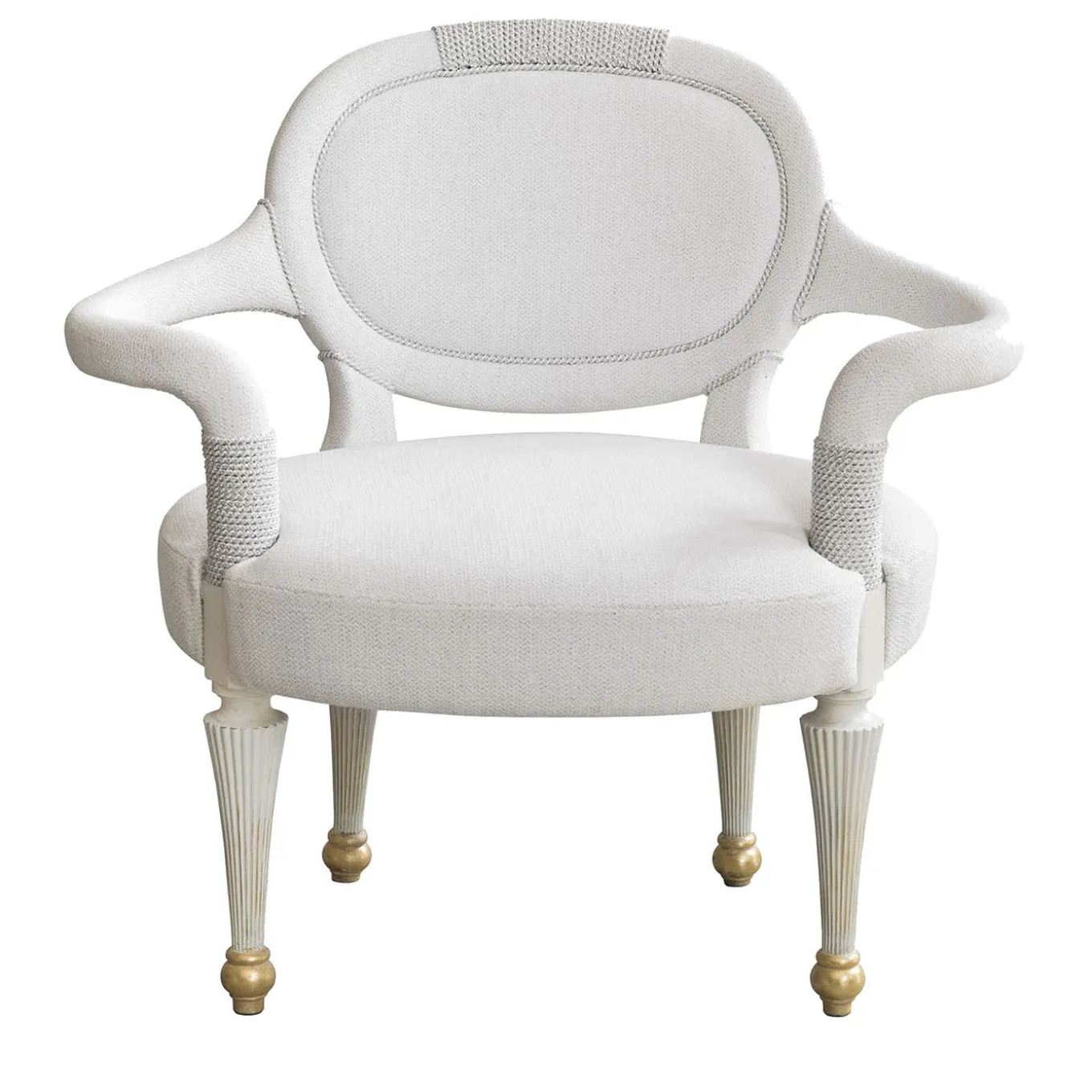 A chair upholstered in white chenille, adorned with decorative cord-wrapped details, exuding elegance and sophistication.
